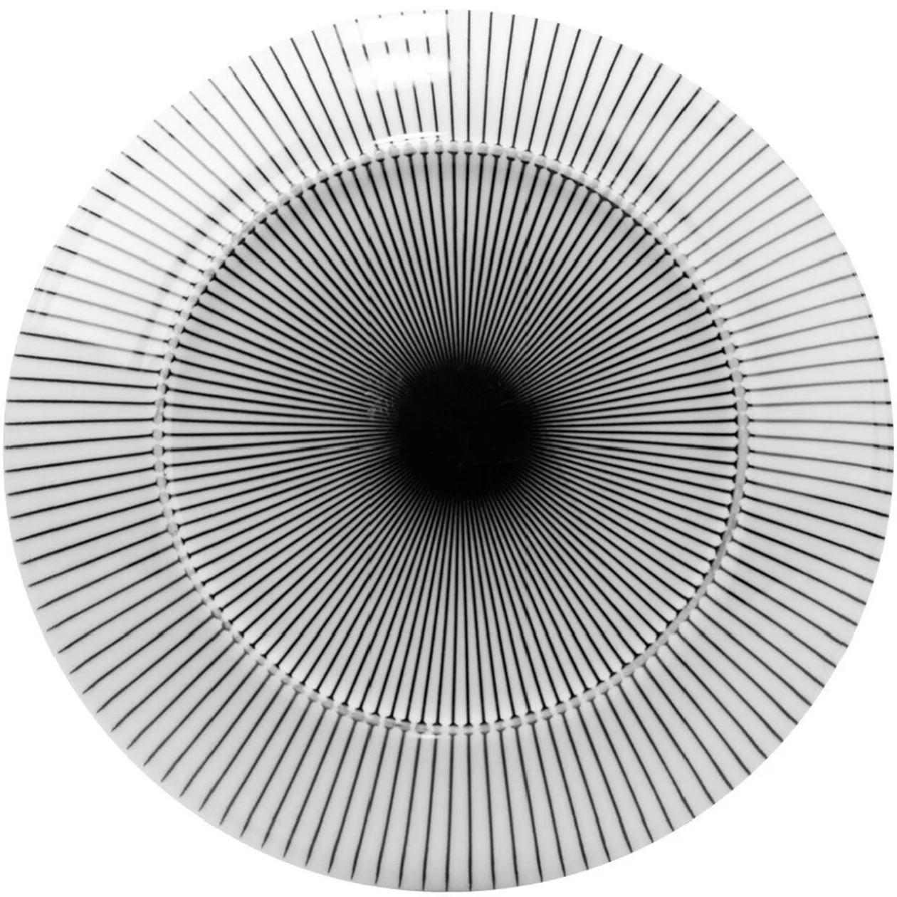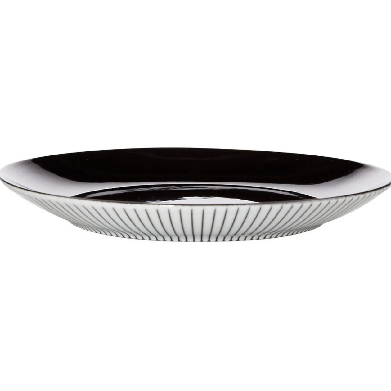 Faites dans l’originalité avec cette assiette à dessert à l’extérieur blanc rayé noir et intérieur noir uni.