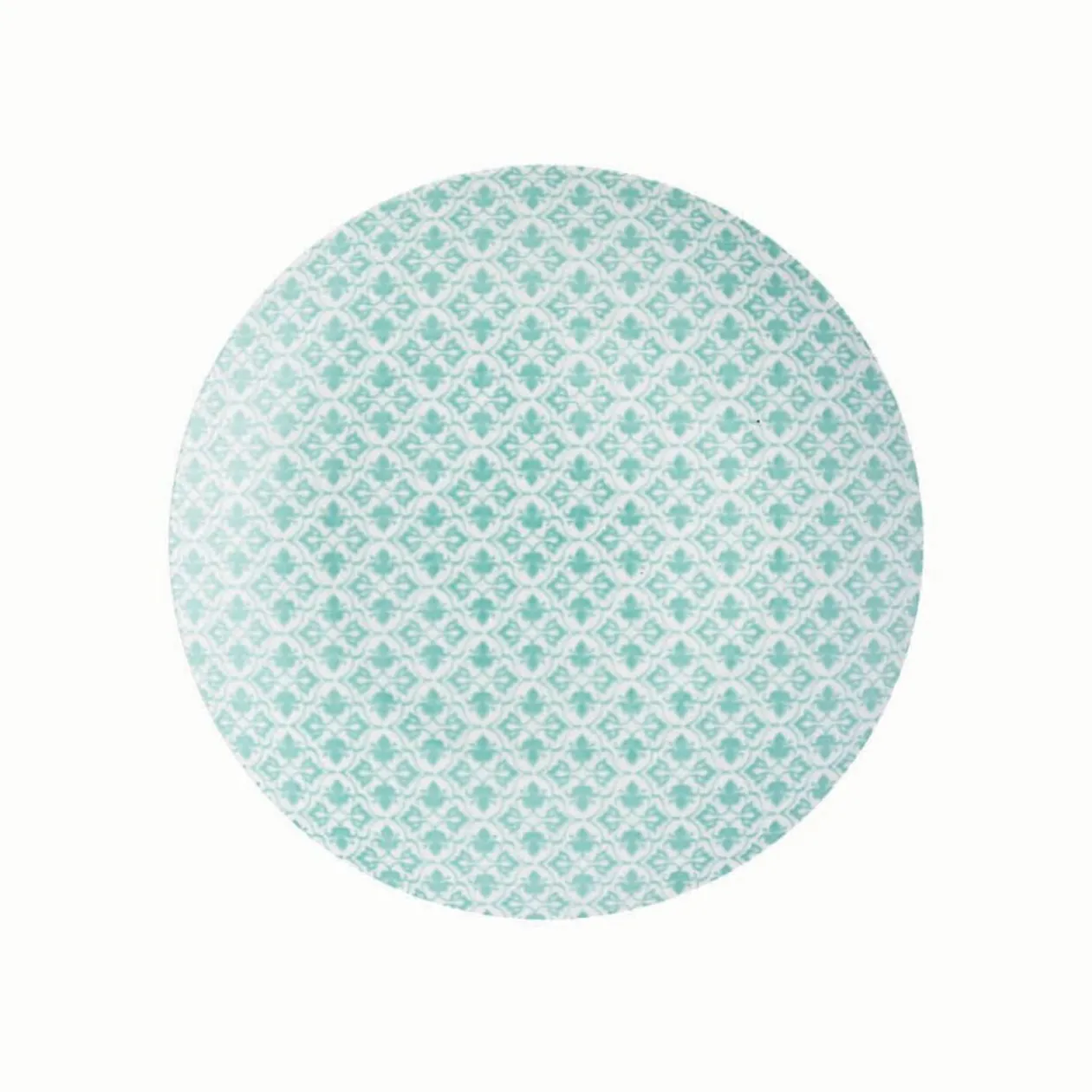 Lot de 4 assiettes à dessert rondes en porcelaine avec motifs géométriques similaires et couleurs pastels différentes pour chacune des assiettes : une rouge, une verte, une bleue, une jaune.