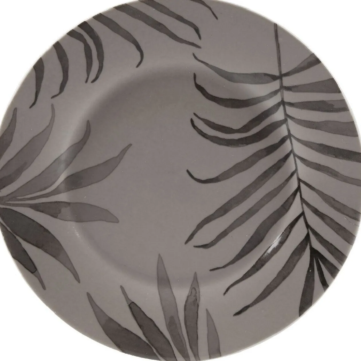 Assiette à dessert ronde en porcelaine de couleur taupe imprimée de feuilles de palmier.