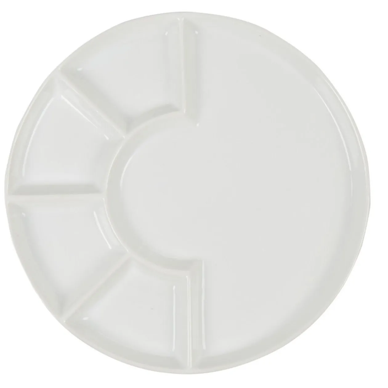 Assiette à fondue / barbecue blanche, 5 compartiments (1 grand pour la viande et 4 pour les sauces), dim. Ø23,8xh.2,2 cm, porcelaine.