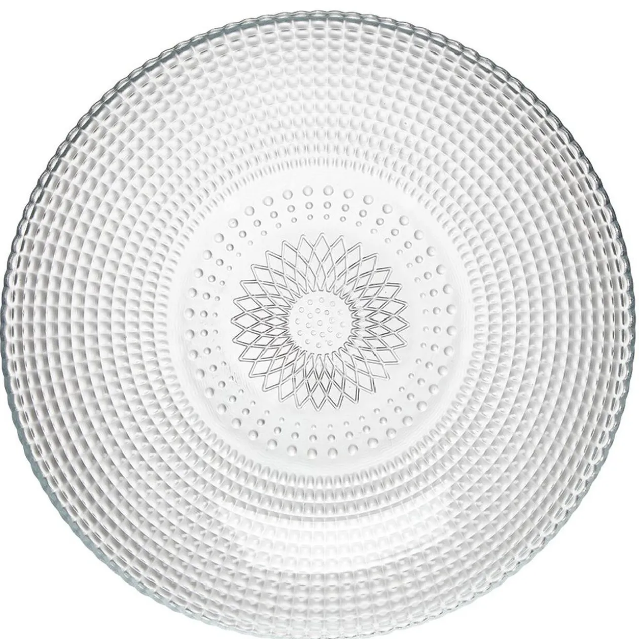 Assiette creuse de forme ronde avec relief de couleur blanc transparent.