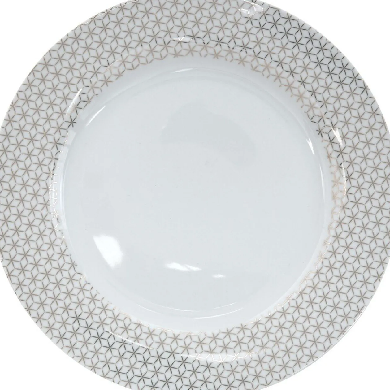 Assiette plate blanche au bord décoré d’un motif graphique doré.