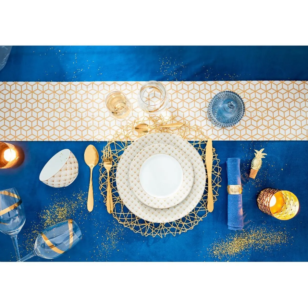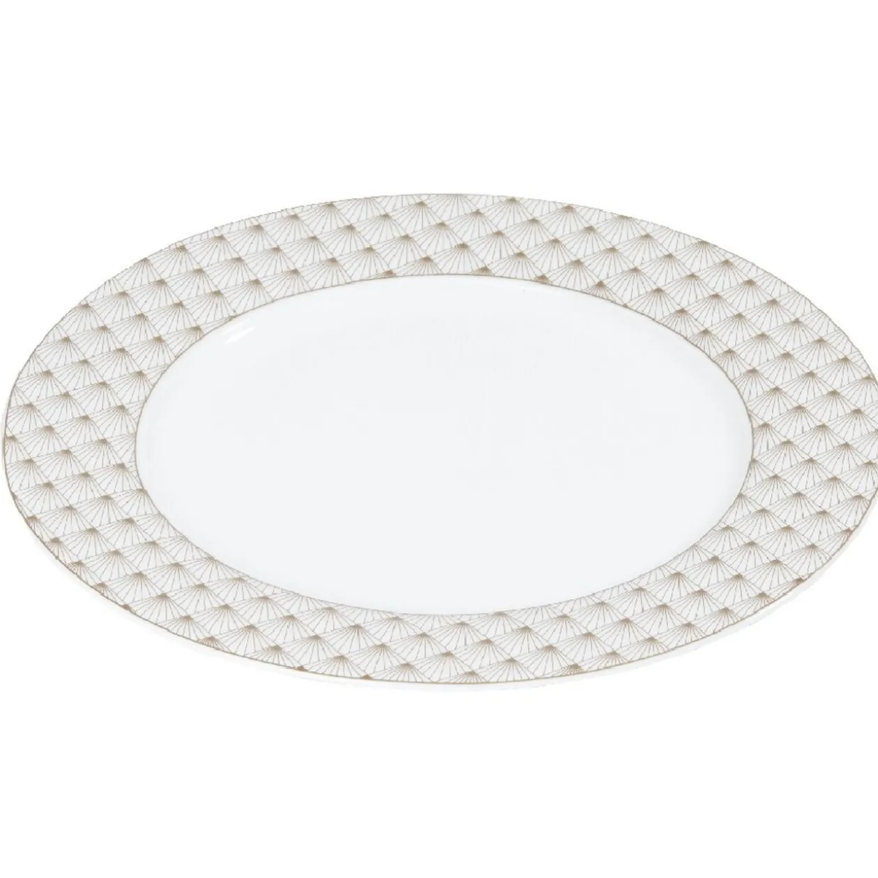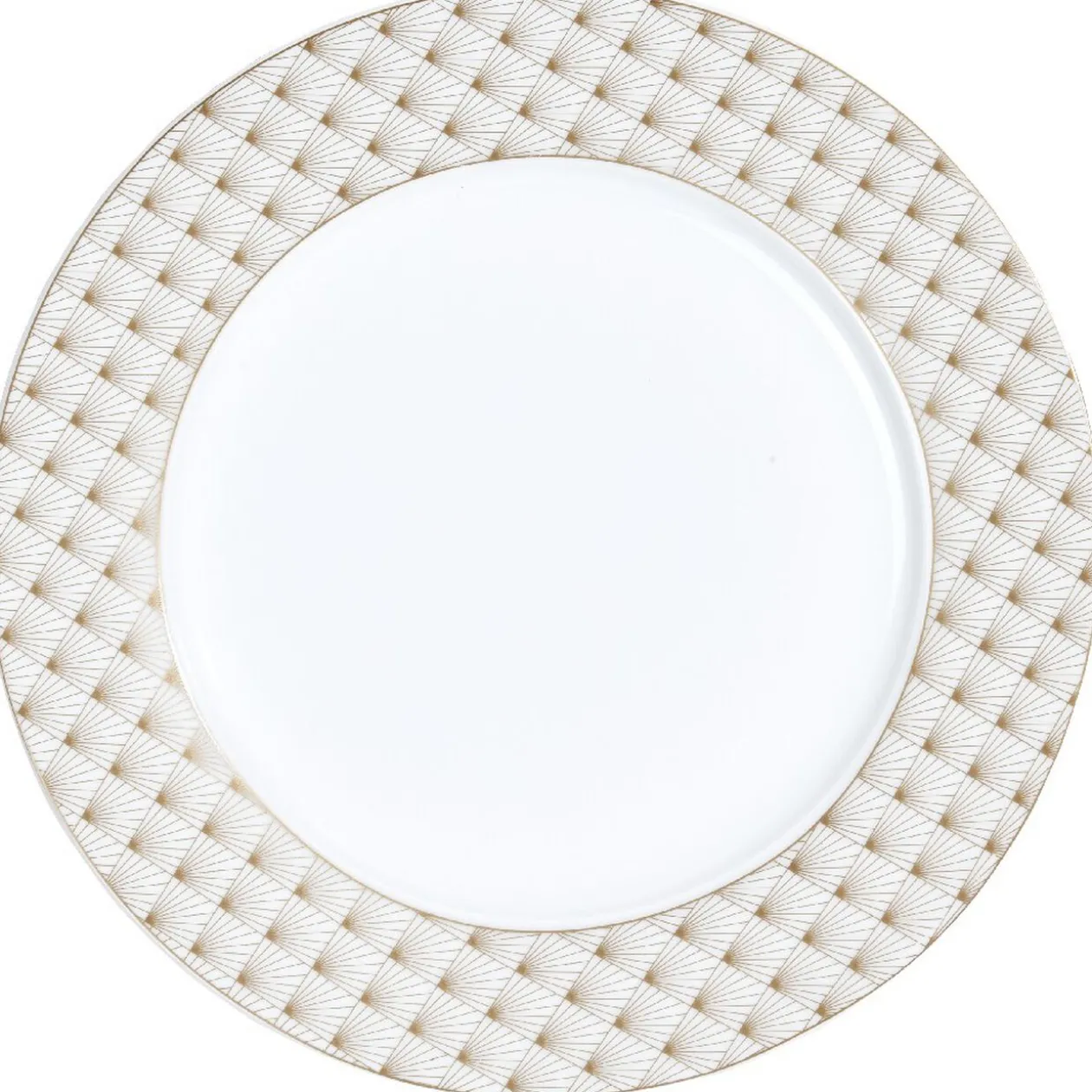 Les plats de fêtes seront à l’honneur grâce à cette assiette plate blanche bordée de rayons dorés.