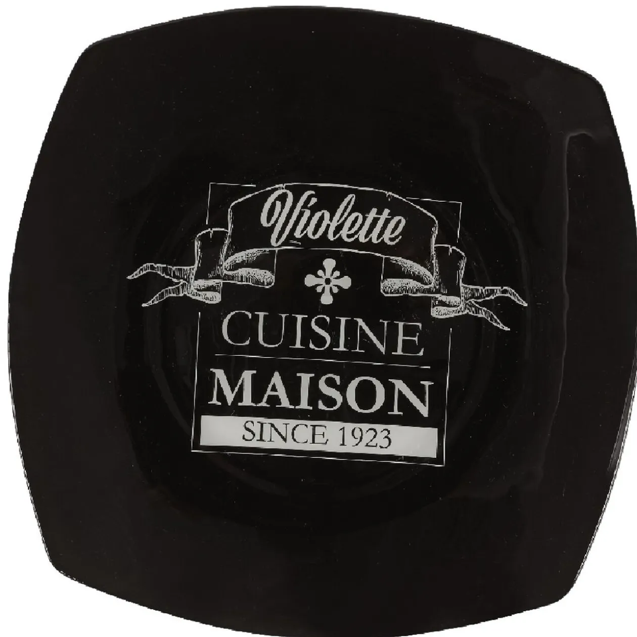 Assiette plate carrée noire avec inscription blanche « Violette-dessert maison-Since 1923 », collection Hipster Factory.