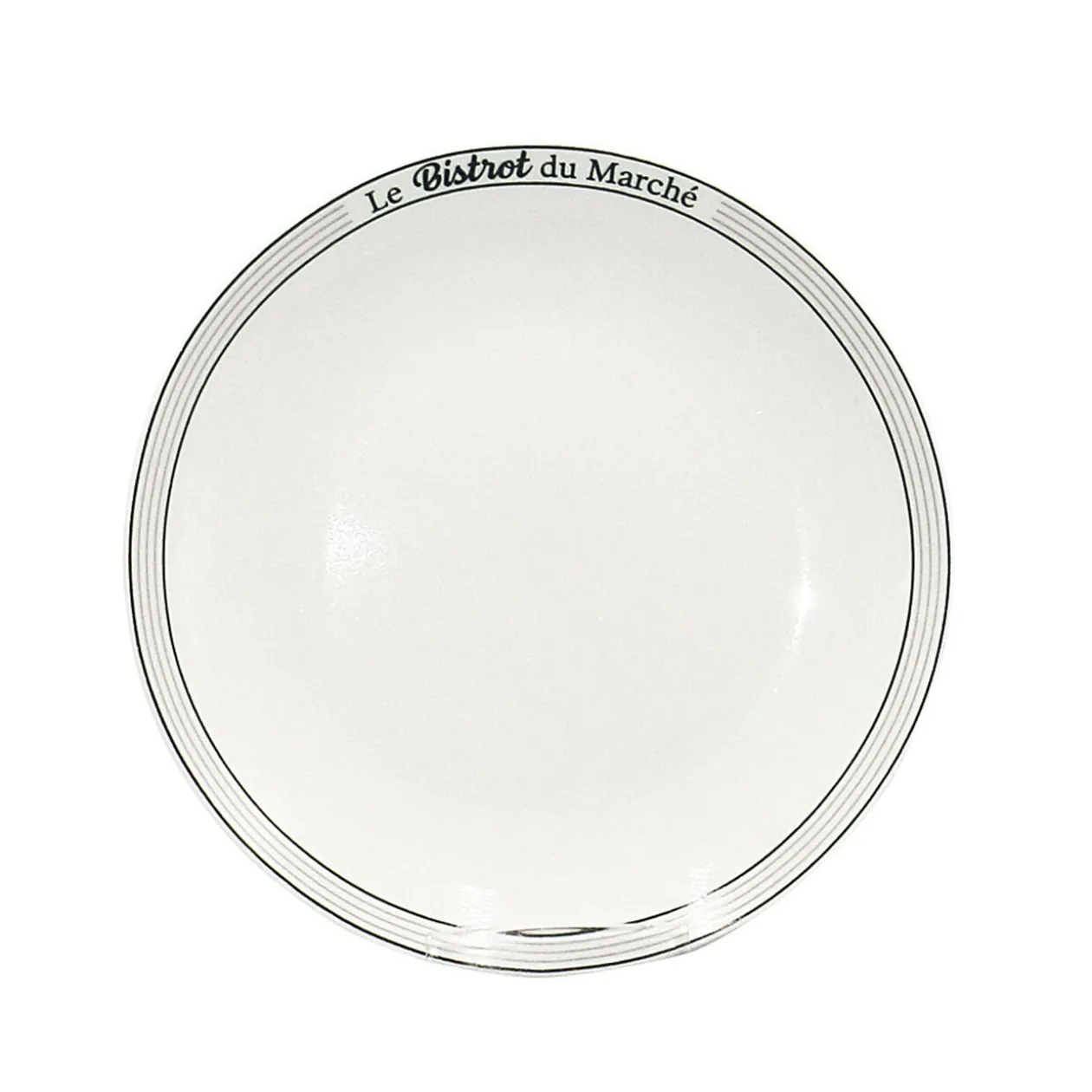 Assiette plate blanche avec liseré noir et inscription « Le petit bistrot » sur le contour.