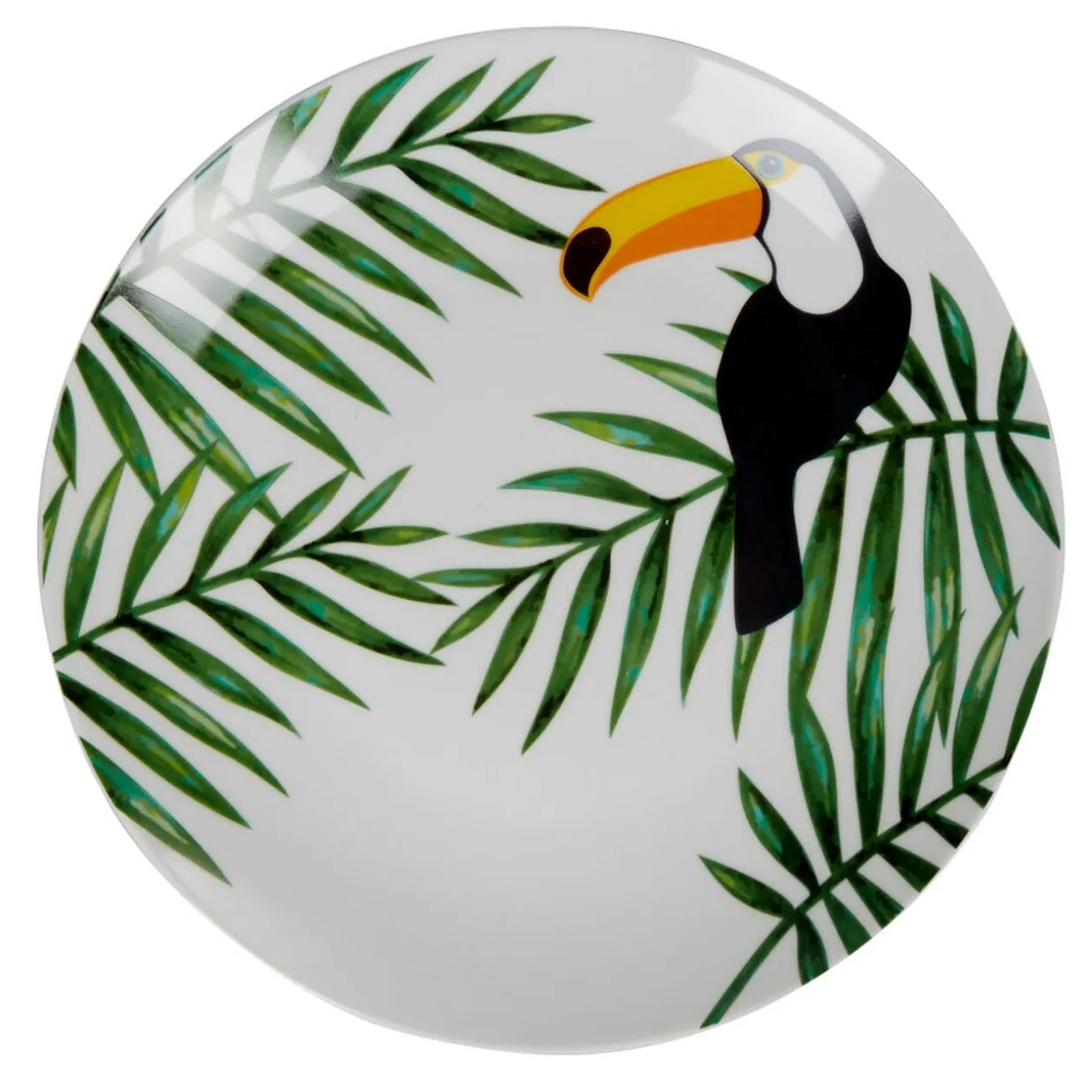 Assiette plate ronde et blanche décorée de motifs exotiques feuillages verts ettoucan, le tout dans un style tropical !