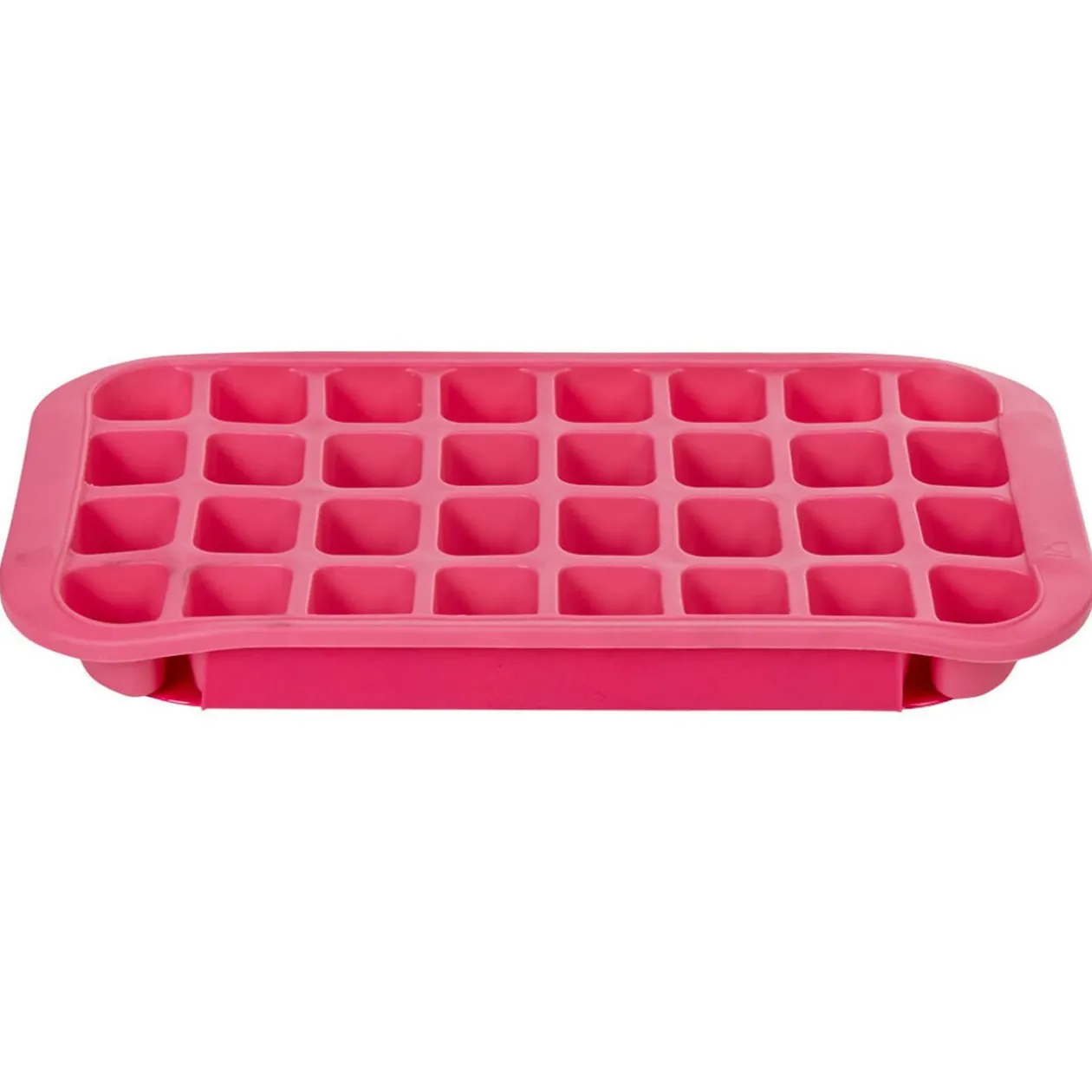 Bac à glaçons 32 compartiments, en plastique de couleur rose.