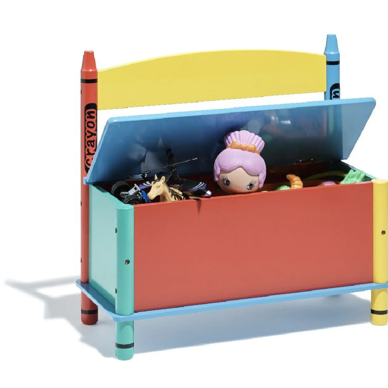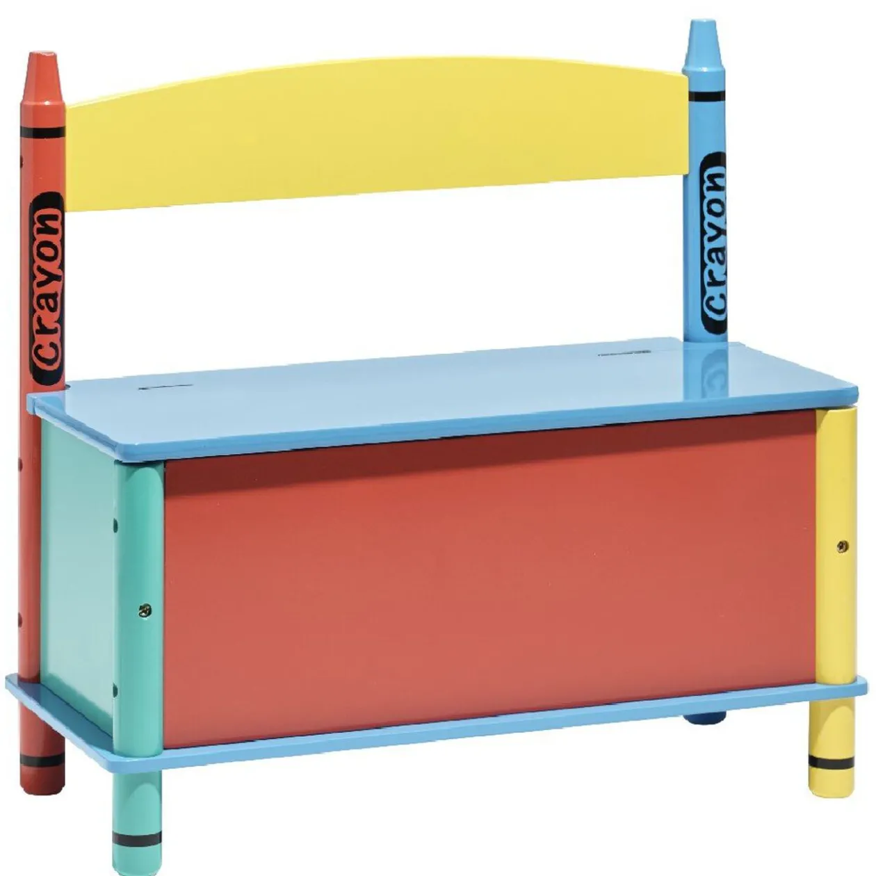 Banc coffre à jouets multicolore pour enfants,pieds en forme de crayons.