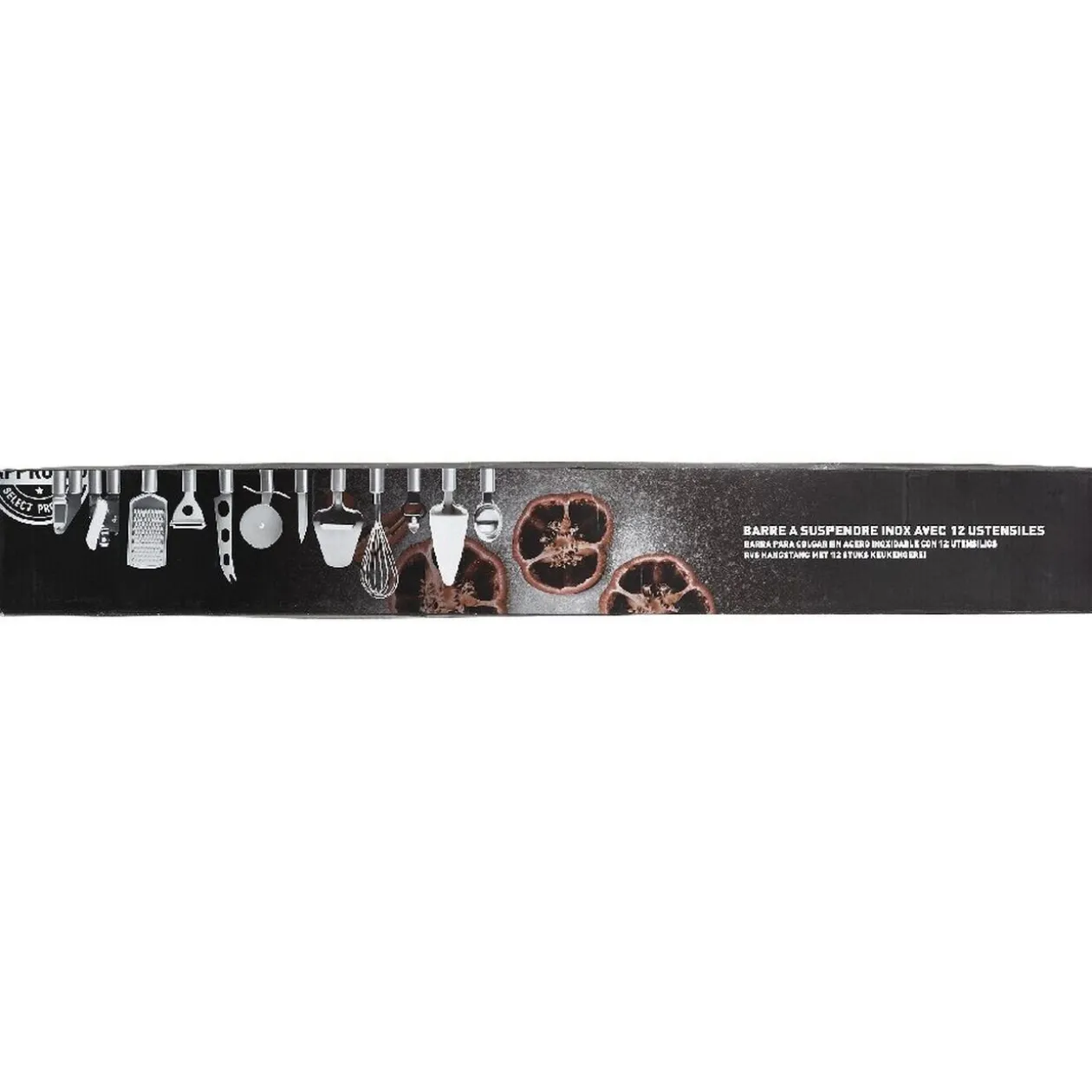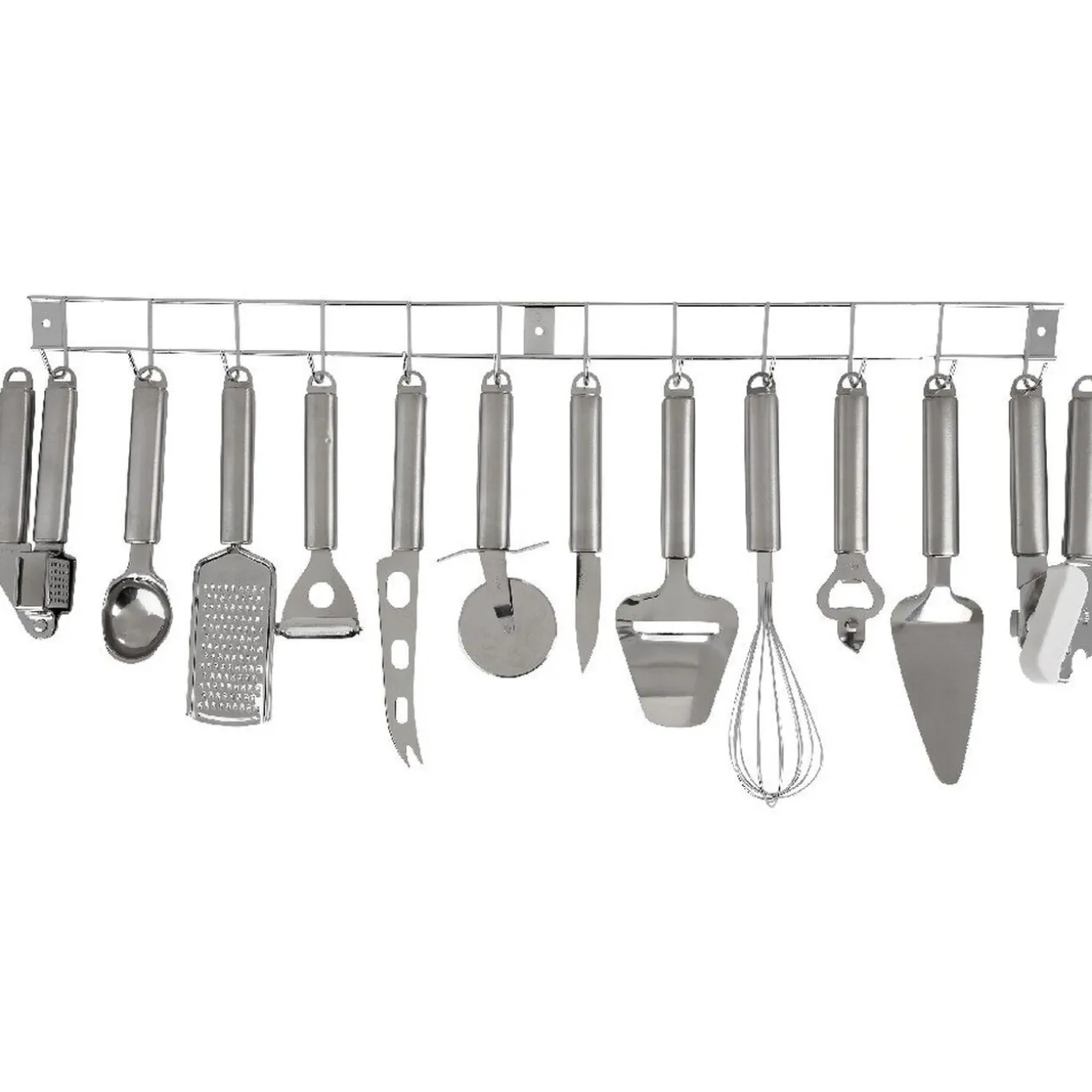 Suspendez et accédez facilement à 12 ustensiles de cuisine grâce à cette barre à fixer pour déguster des pizzas, du fromage, de bonnes tartes, des pommes de terre… Le lot complet pour une cuisine pratique contenant : 1 couteau, 1 fouet, 1 économe, 1 presse ail, 1 ouvre-boîte, 1 roulette à pizza,1 râpe à fromage, 1 tranche fromage, 1 couteau à fromage, 1 pelle à tarte,1 cuillère à glace, 1 décapsuleur et une barre à fixer.