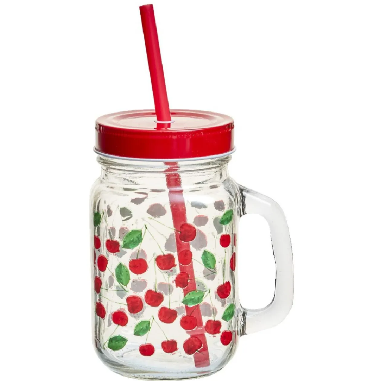 Tasse à anse d’inspiration rétro avec paille et couvercle rouges. On adore les motifs cerises sur la partie transparente du bocal. Ce bocal à anse fera fureur auprès des grands et des petits !