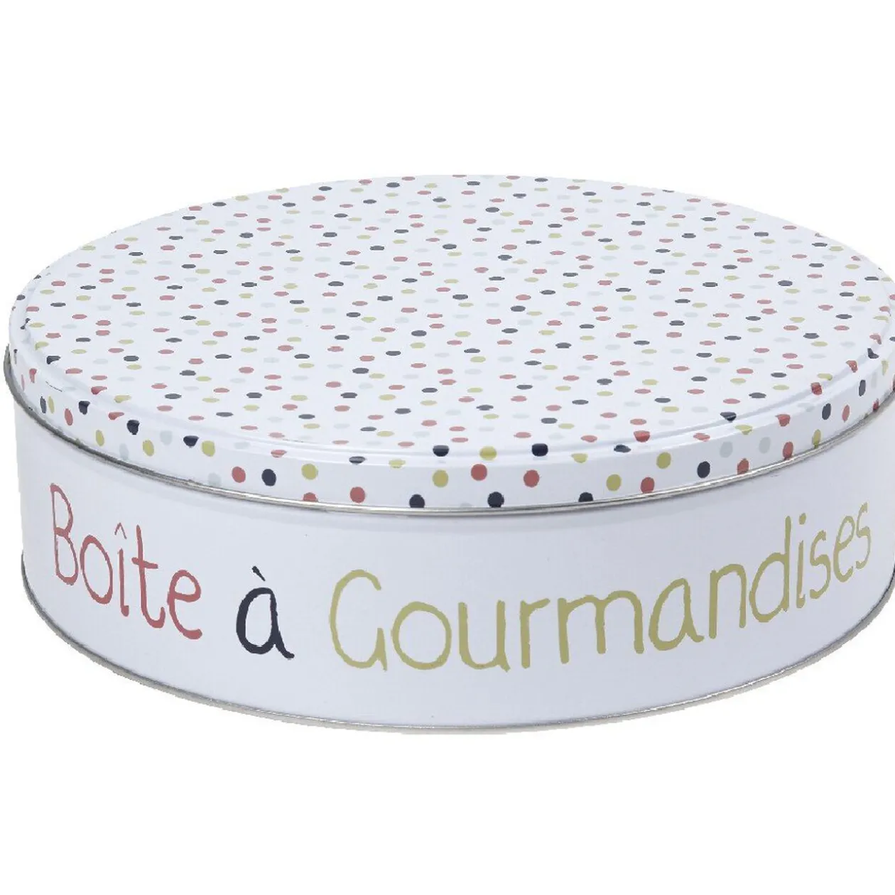 Boîte à gourmandises ronde blanche motifs pois multicolores.