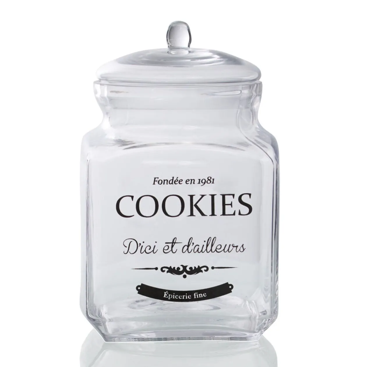 Bonbonnière en verre transparent avec inscription en noir « cookies ».