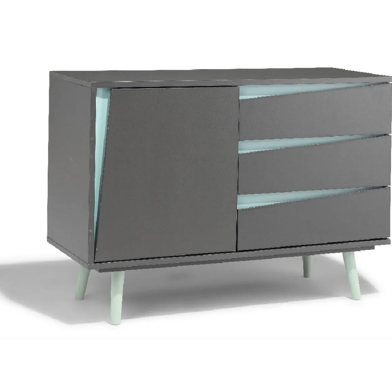 Placé dans votre salle à manger, le buffet Jamy en deviendra rapidement un des éléments de décoration principaux. Avec son coloris anthracite et les touches de vert d’eau de ses tiroirs et de sa porte, il est à la fois sobre, élégant et original. Vous remarquerez d’ailleurs le rappel de couleur de ses pieds en bois de pin obliques, fins et discrets, qui lui donnent un côté presque aérien. Pratique, il vous offre plusieurs espaces de rangement avec ses 3 tiroirs et sa partie gauche munie d’une porte.