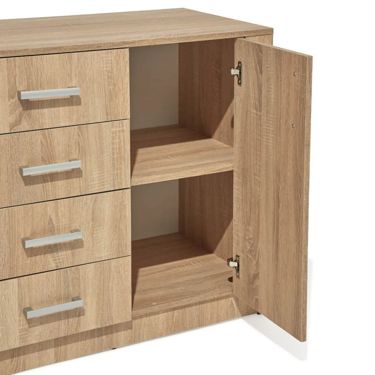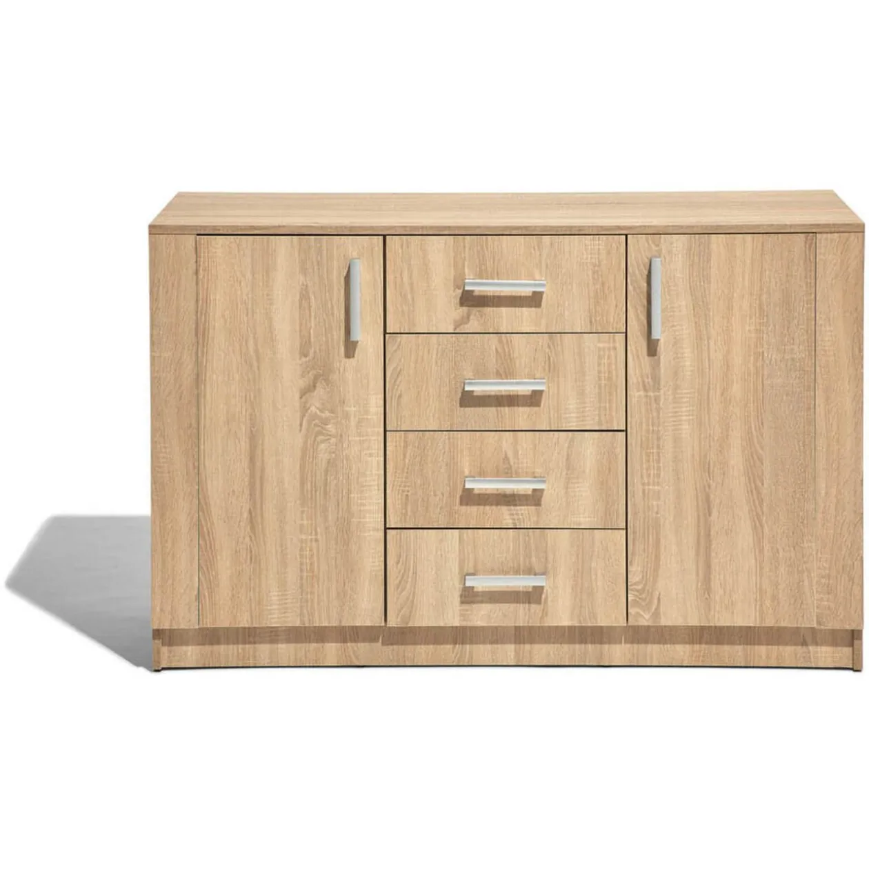 Le buffet Ohio est muni de quatre tiroirs et de deux portes ouvrant sur des compartiments munis d’une étagère. Pratique, il vous permettra de ranger votre vaisselle ou d’autres effets personnels et d’y avoir facilement accès. Placé dans votre salle à manger, il vous aidera à rester organisé et à gagner du temps lorsque vous recevrez vos invités. Il n’en reste pas moins très élégant avec ses lignes simples et sa finition chêne sonoma, laquelle apportera chaleur et authenticité à votre pièce de vie. Notre astuce déco : optez pour d’autres meubles et accessoires dans les teintes claires afin de faire de votre espace de vie un endroit agréable et convivial.