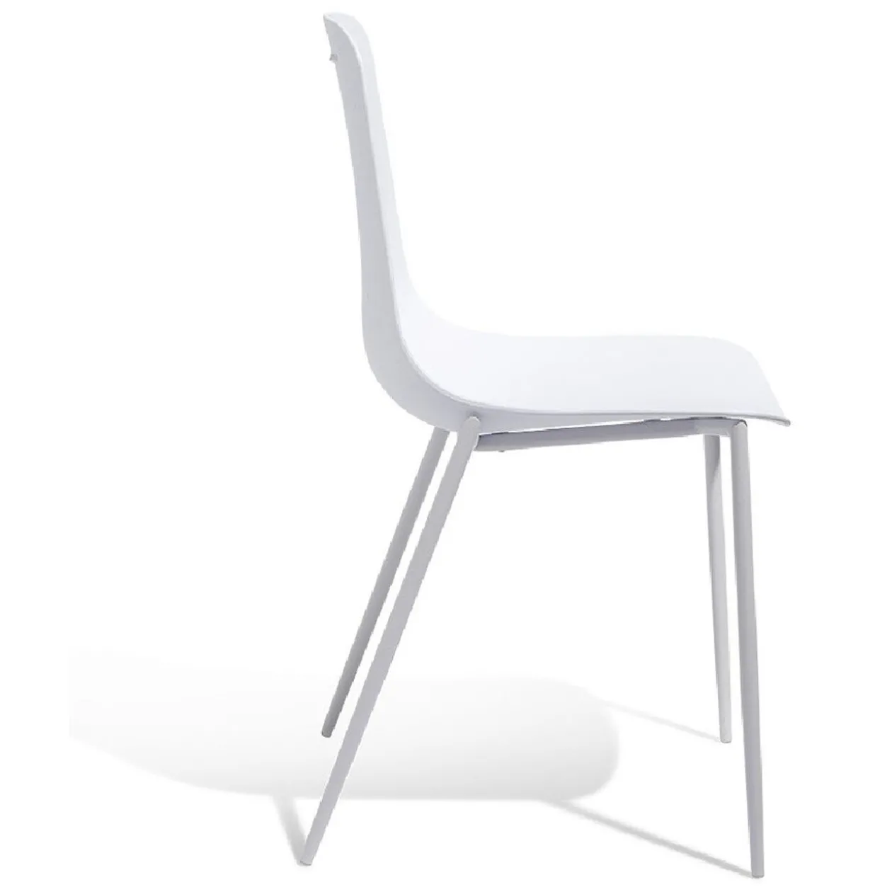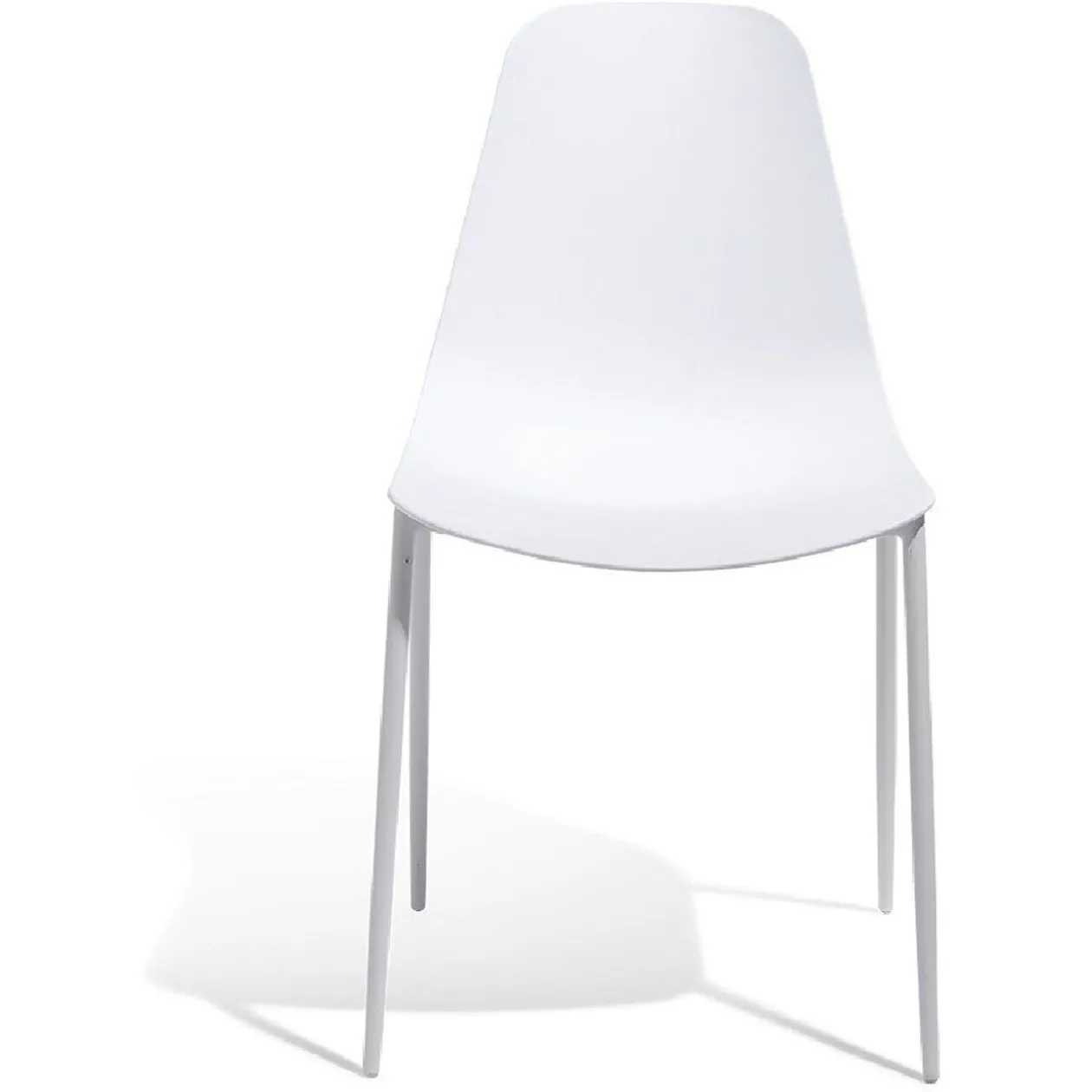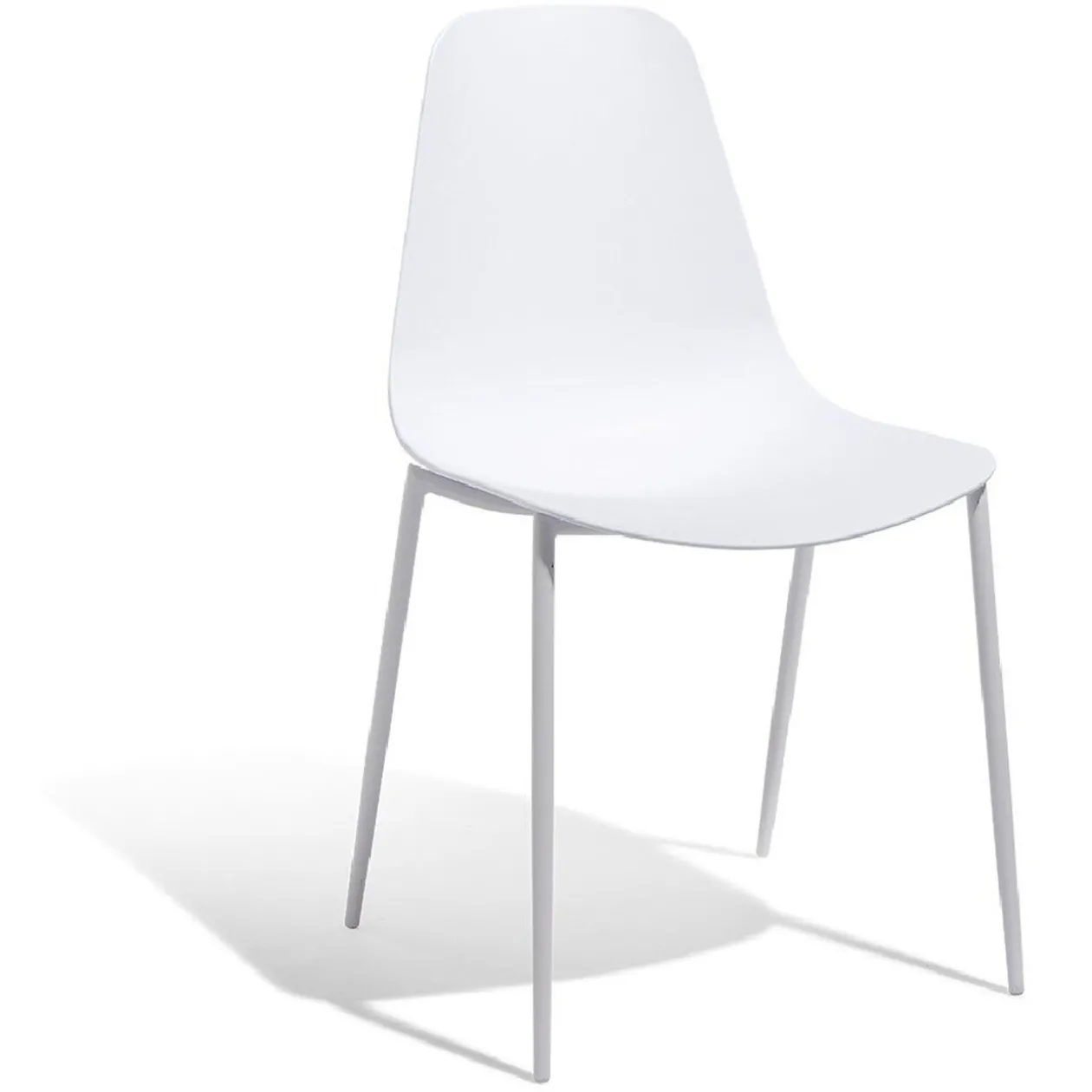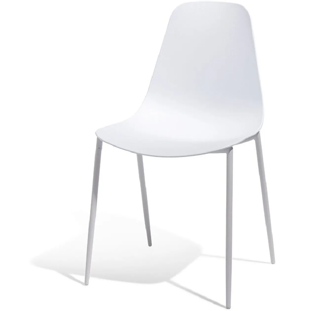 Chaise Lenny blanche avec coque design en polypropylène et pieds en métal légèrement inclinés.