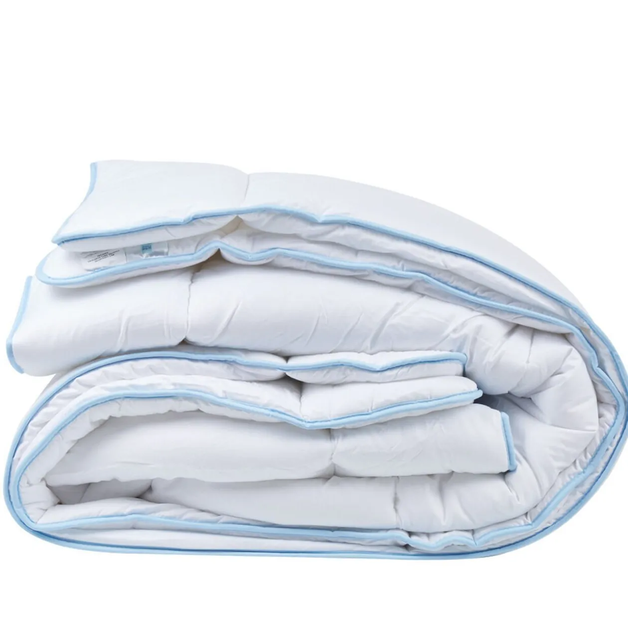 Couette 2 personnes blanche chaude 450 g/m2, dim. 220×240 cm, enveloppe 100 % coton et garnissage 100 % polyester – fibres creuses siliconées.