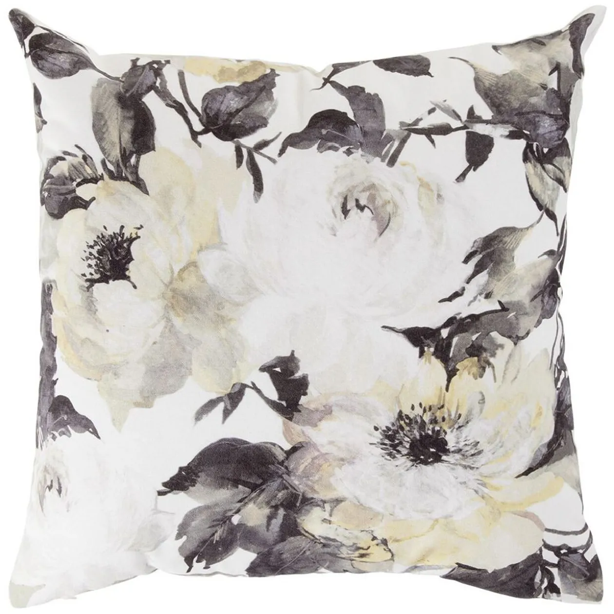Coussin carré avec imprimé floral style nature morte blanc et gris, parfait pour agrémenter votre intérieur.