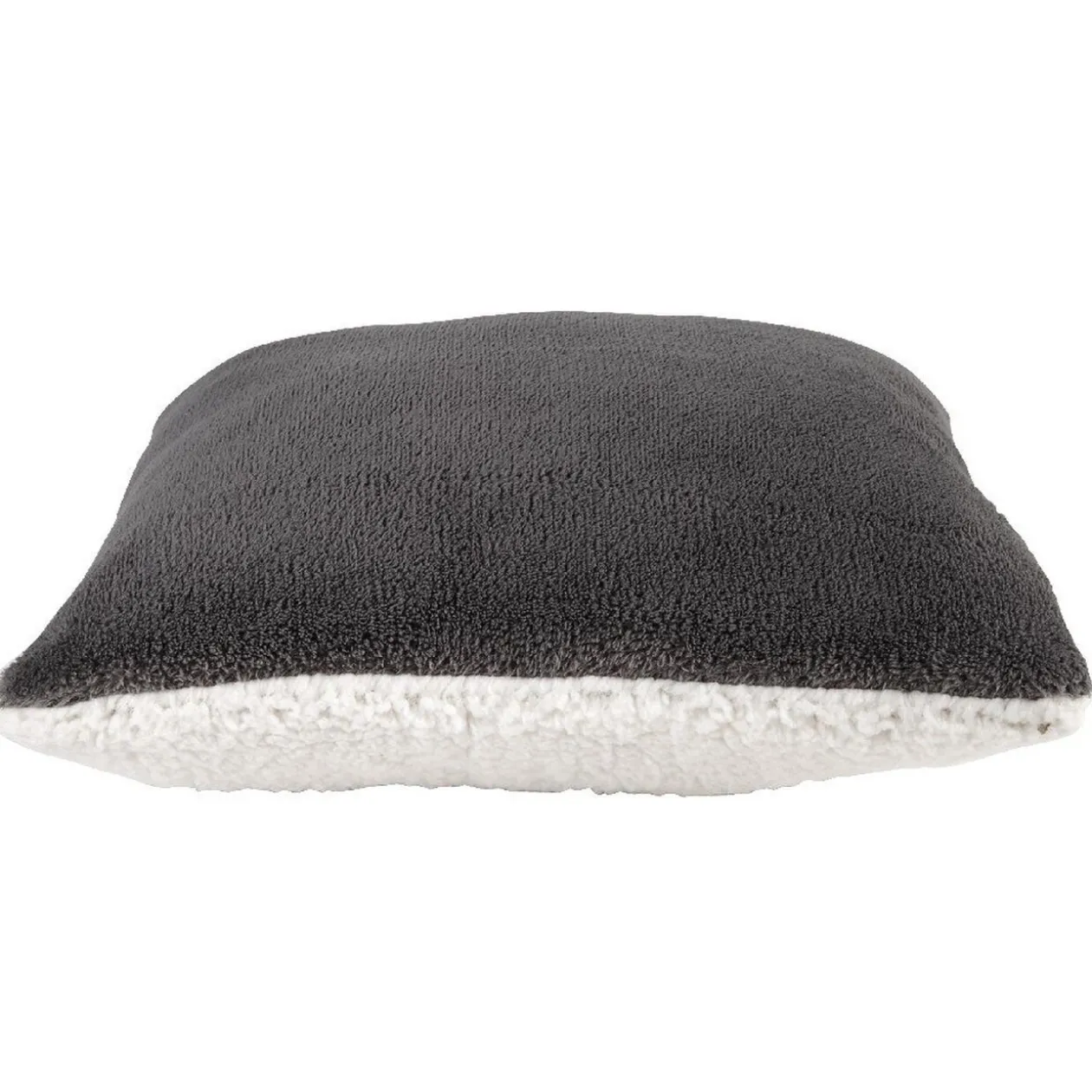 Coussin à double face, 1 grise et 1 blanche, en tissu effet pilou pilou.