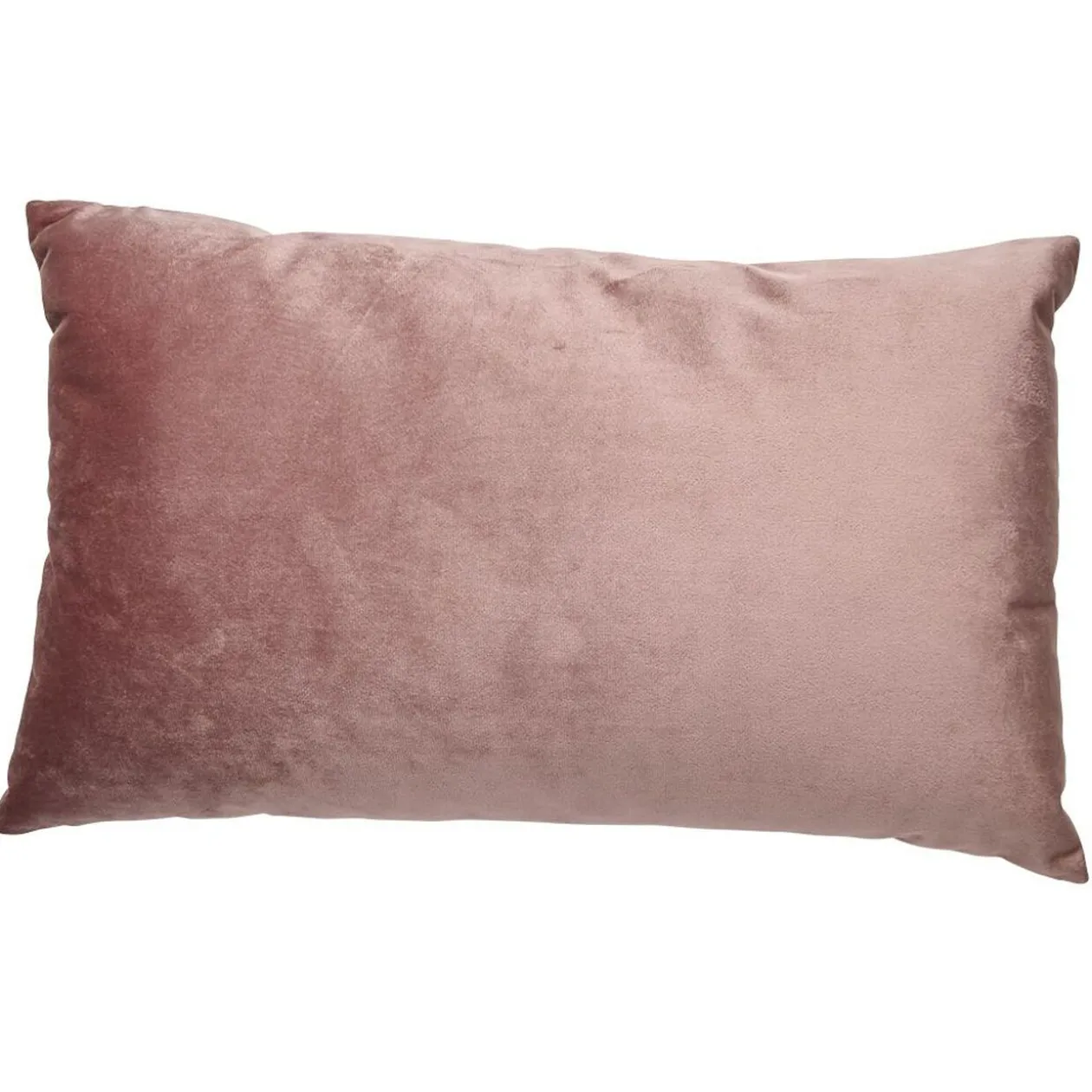 Coussin rectangulaire imitation velours de couleur vieux rose avec inscription dorée pailletée « Love » en sequins.