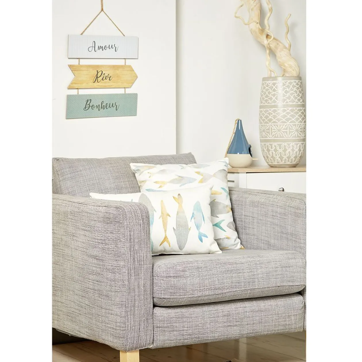 Ce coussin rectangulaire de couleur blanche avec imprimé poissons multicolores est idéal pour agrémenter votre décoration intérieure.