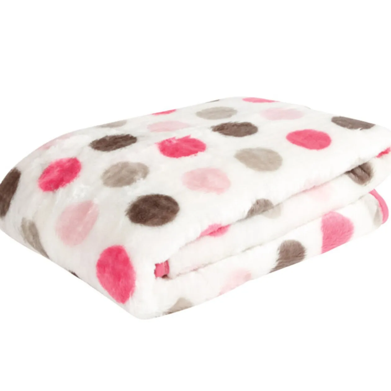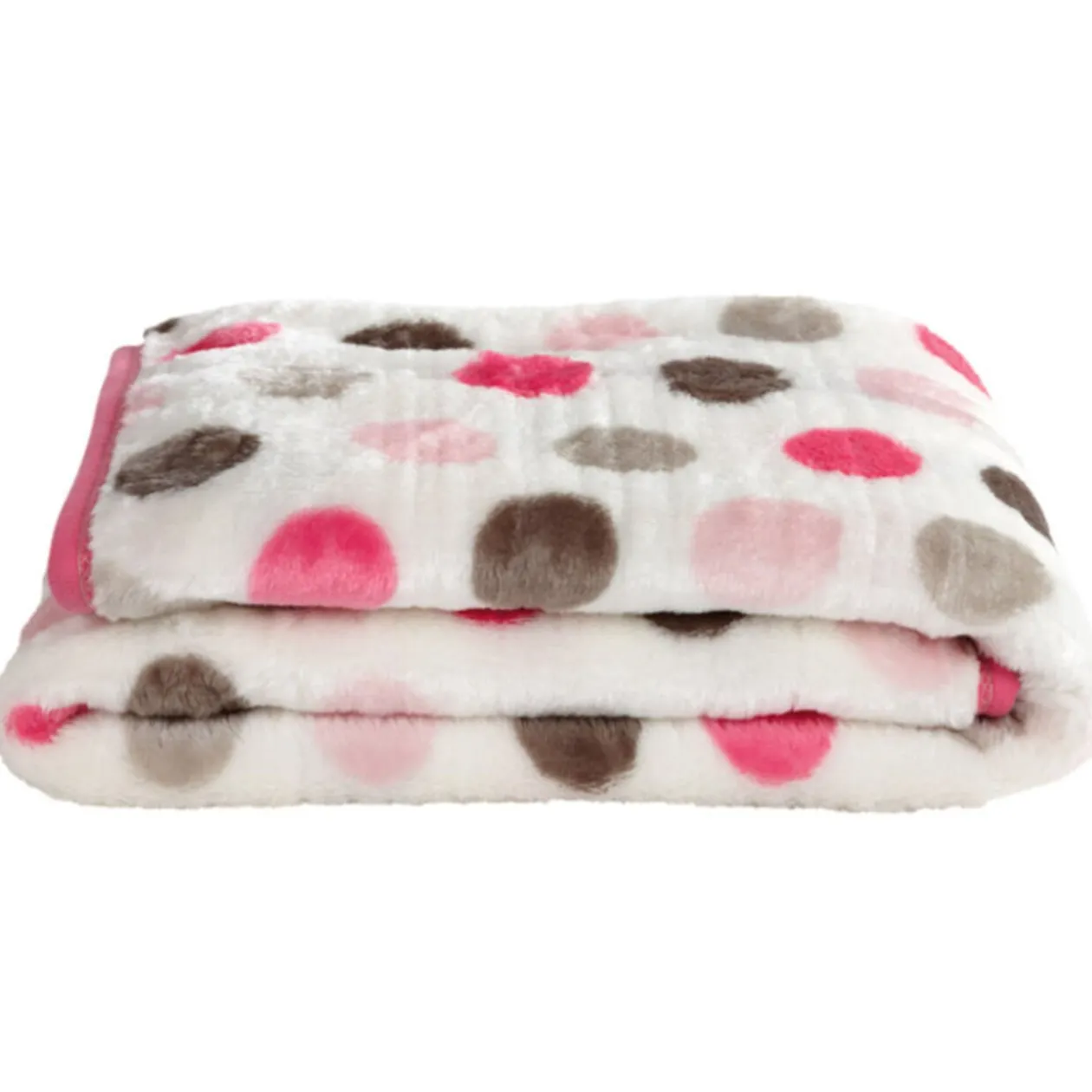 Couverture motifs Pois, dim. 140×190 cm, 100 % polyester, aspect soyeux. Coloris : blanc, rose et gris.
