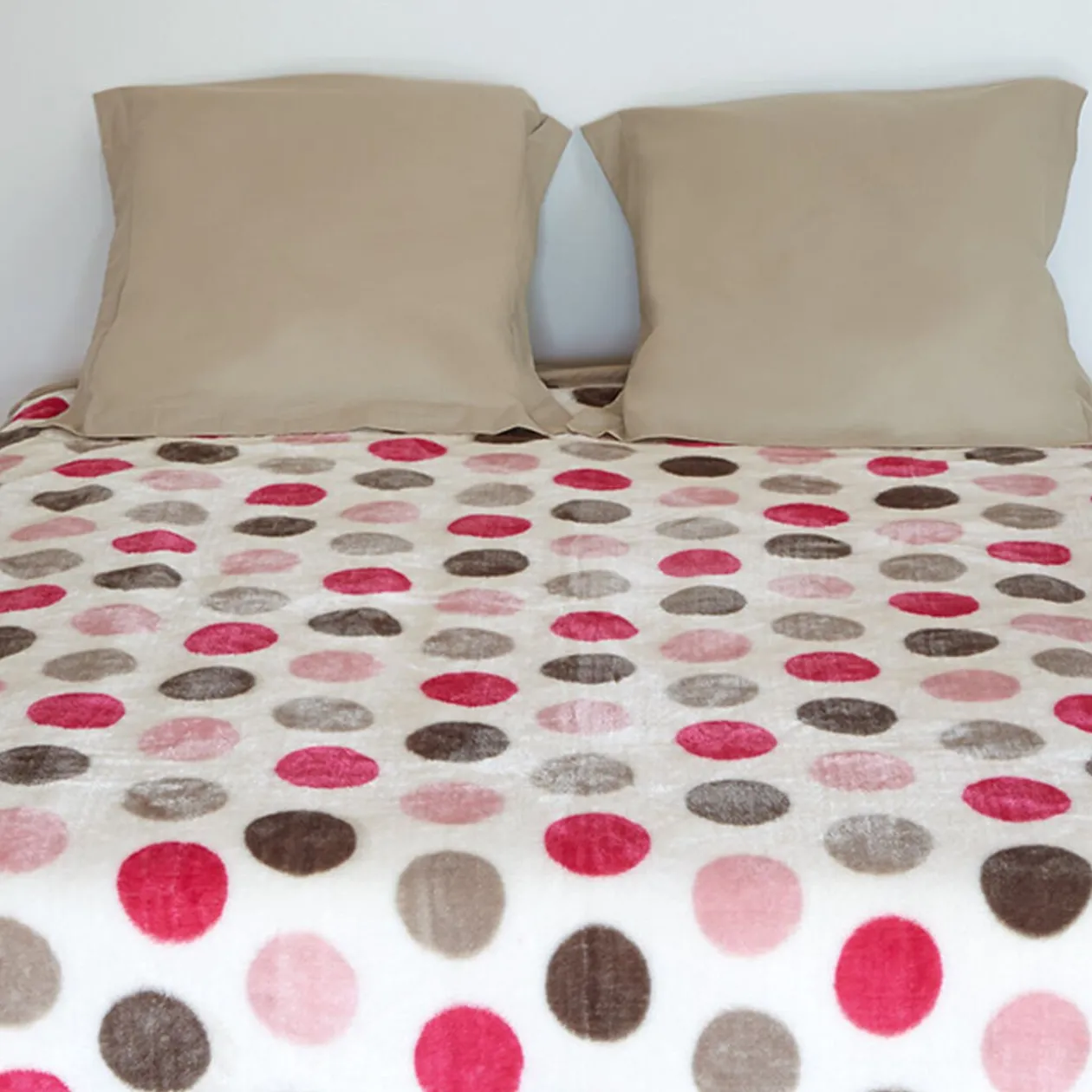 Couverture blanche à pois colorés, dim. 140×190 cm, 100 % polyester.