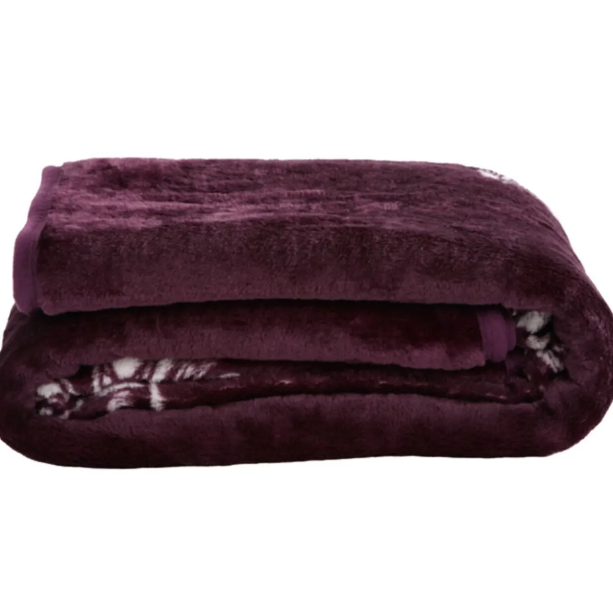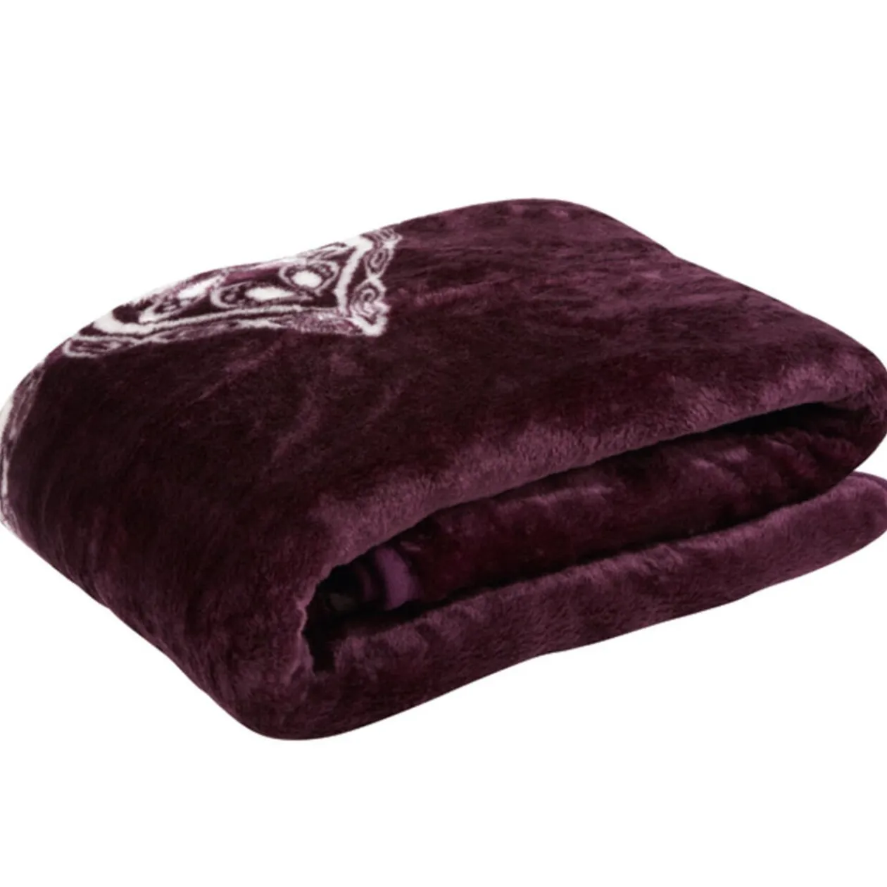 Couverture 1 personne design ethnique, dim. 140×190 cm, polyester aspect soyeux. Coloris : prune et blanc.