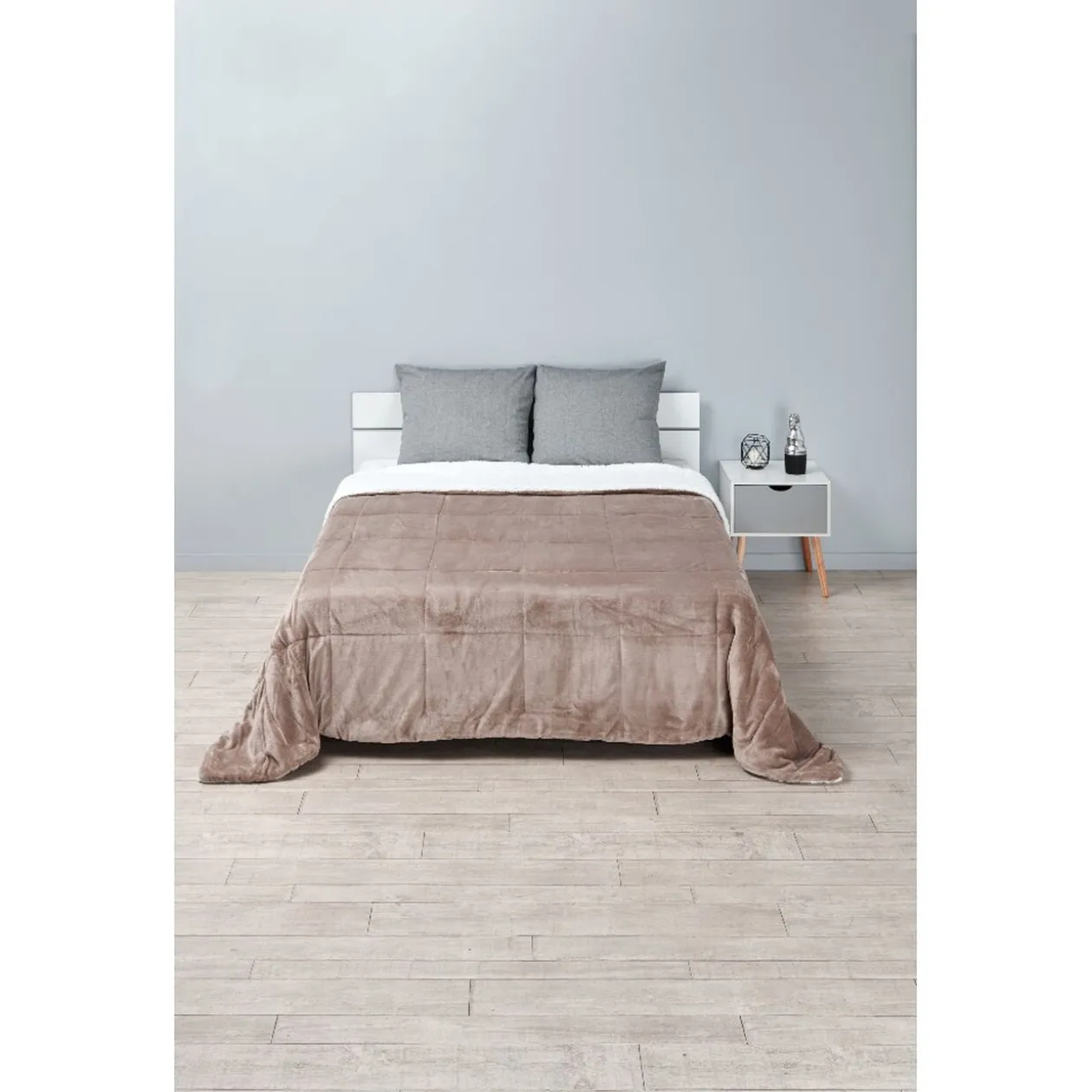 Couverture biphasée: 1 face effet fourrure et 1 face toucher velours. -Dimensions:l 220 x L 240 cm. -Matière: polyester
