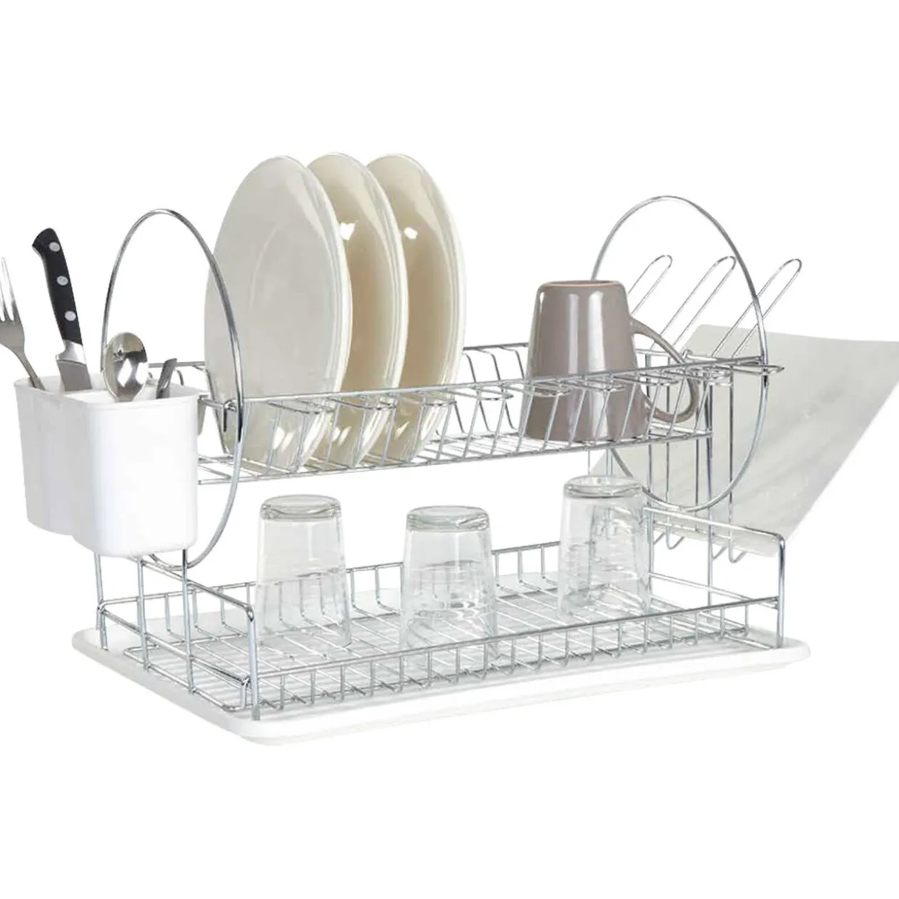 Égouttoir en acier sur 2 niveaux doté d’un receveur d’eau et d’un sèche couverts en plastique blanc.