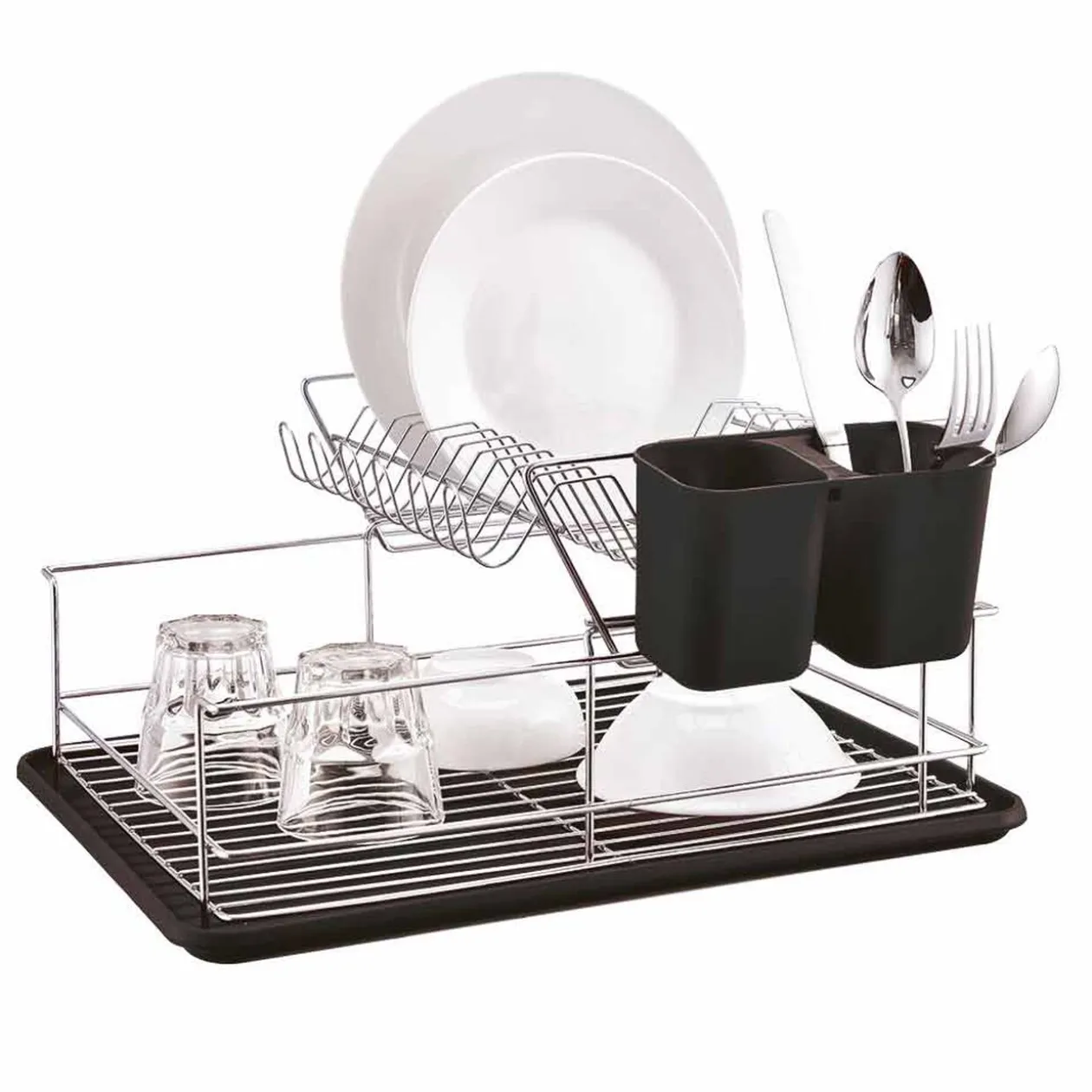Égouttoir à 2 niveaux en acier doté d’un receveur d’eau et d’un sèche couverts en plastique noir.