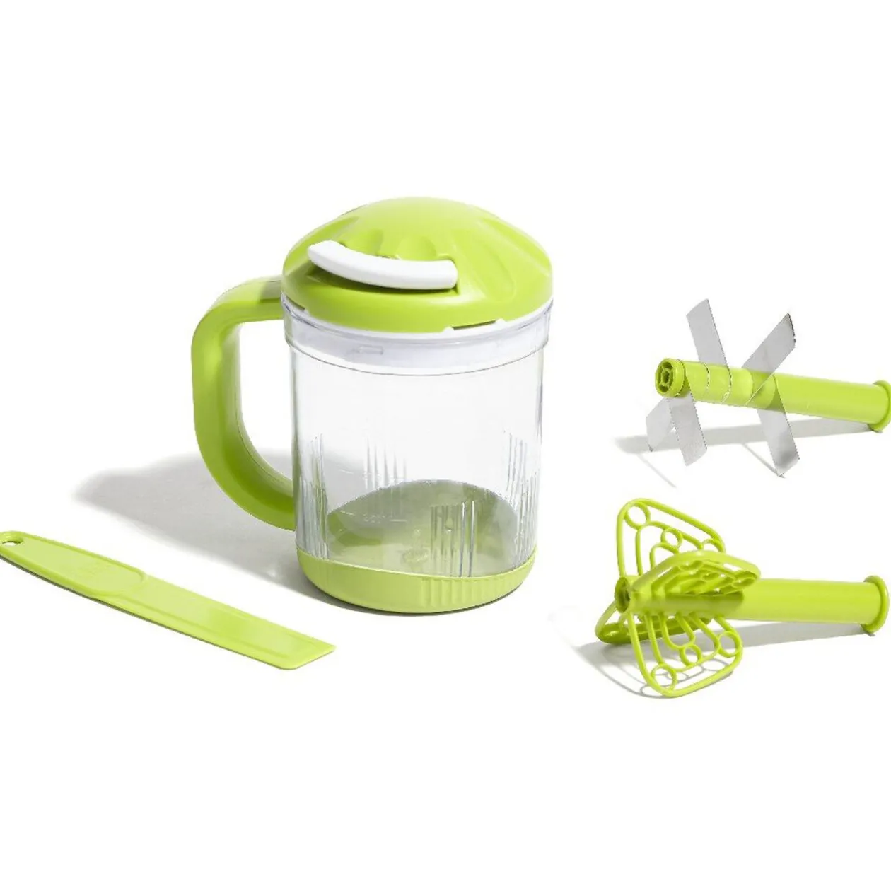 Hachoir manuel comprenant 1 récipient, 1 batteur, 1 couteau à 5 lames en acier et 1 spatule, plastique.