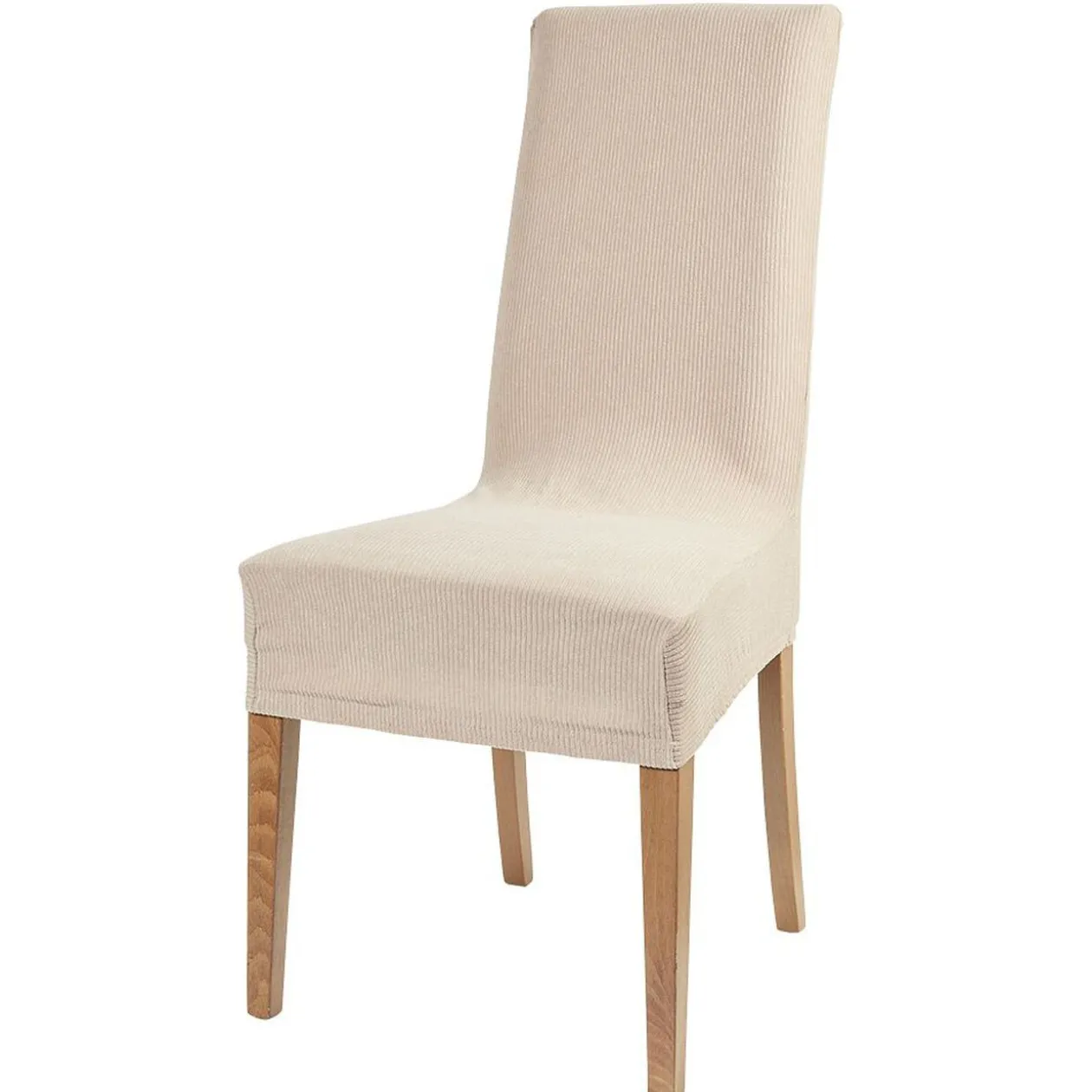 Housse de chaise courte et extensible de couleur unie, parfaite pour habiller dossier et assise d’une chaise.