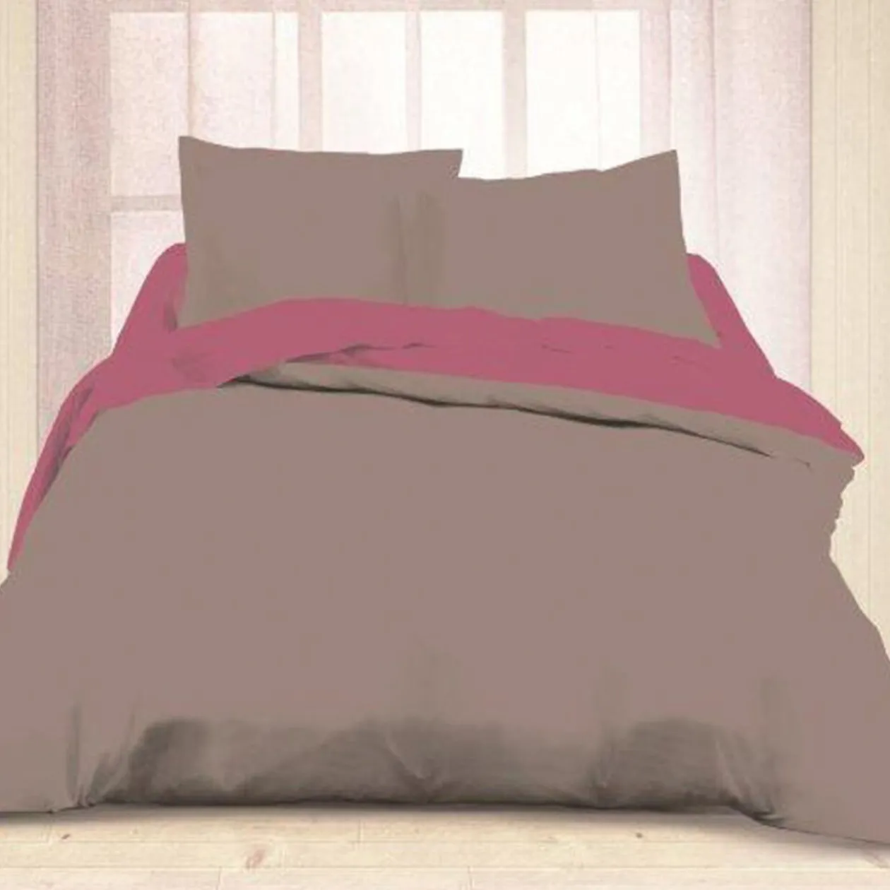 Housse de couette 2 personnes bicolore grise et rose, dim. 240×260 cm, 100 % coton.