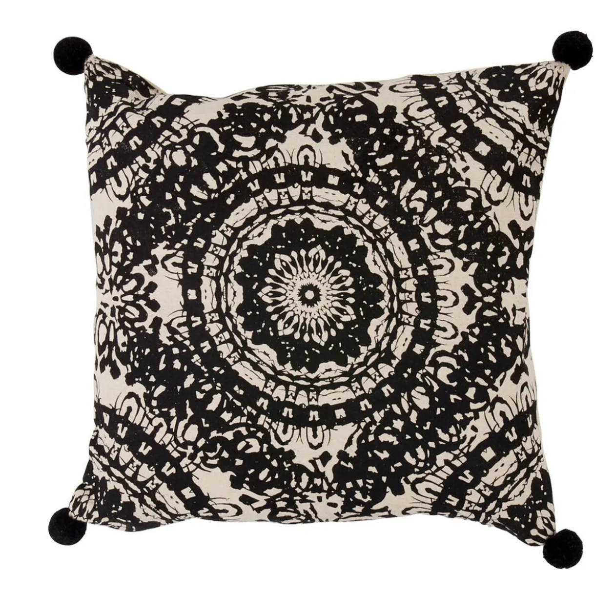 Housse de coussin carrée avec un pompon noir à chaque coin. Coloris noir et blanc avec motif tropical. Nous vous proposons la housse de coussin rectangulaire assortie (référence 505606) ainsi que le jeté de canapé (référence : .