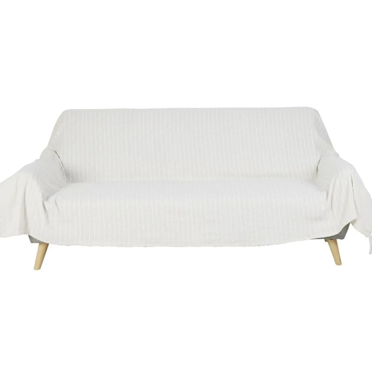 Jeté de canapé à rayures blanches avec franges aux deux extrémités, idéal pour le salon ou sur le sofa dans un bureau.