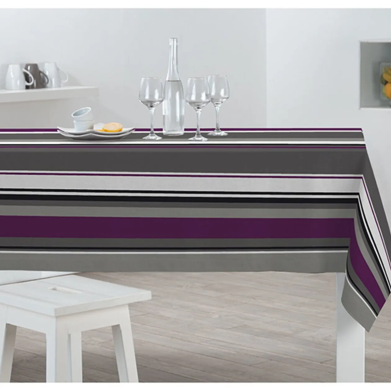 Nappe rectangulaire motifs rayures grises, violettes et blanches, dim. 140×250 cm, polyester.
