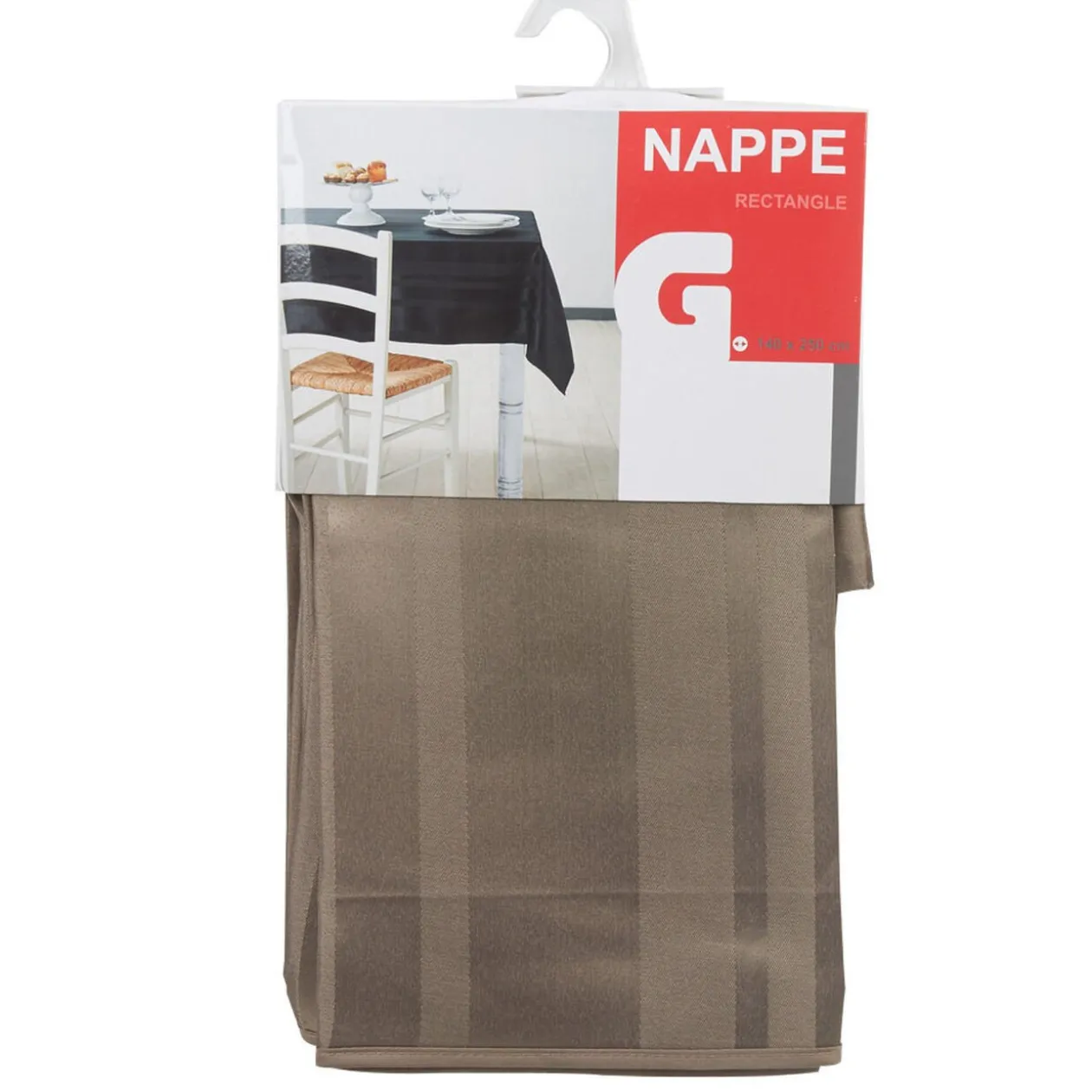 Nappe taupe à rayures rectangulaire jacquard, dim. 140×250 cm, polyester.