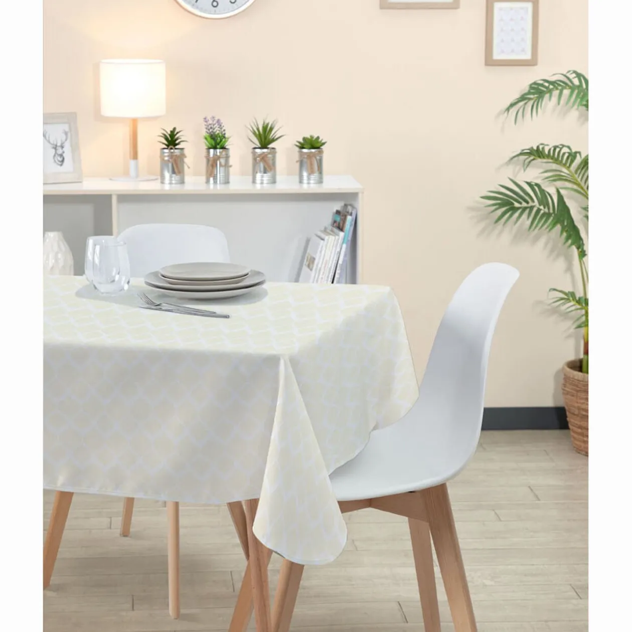 Nappe rectangulaire en tissu jacquard de couleur ivoire à motifs moucharabieh.