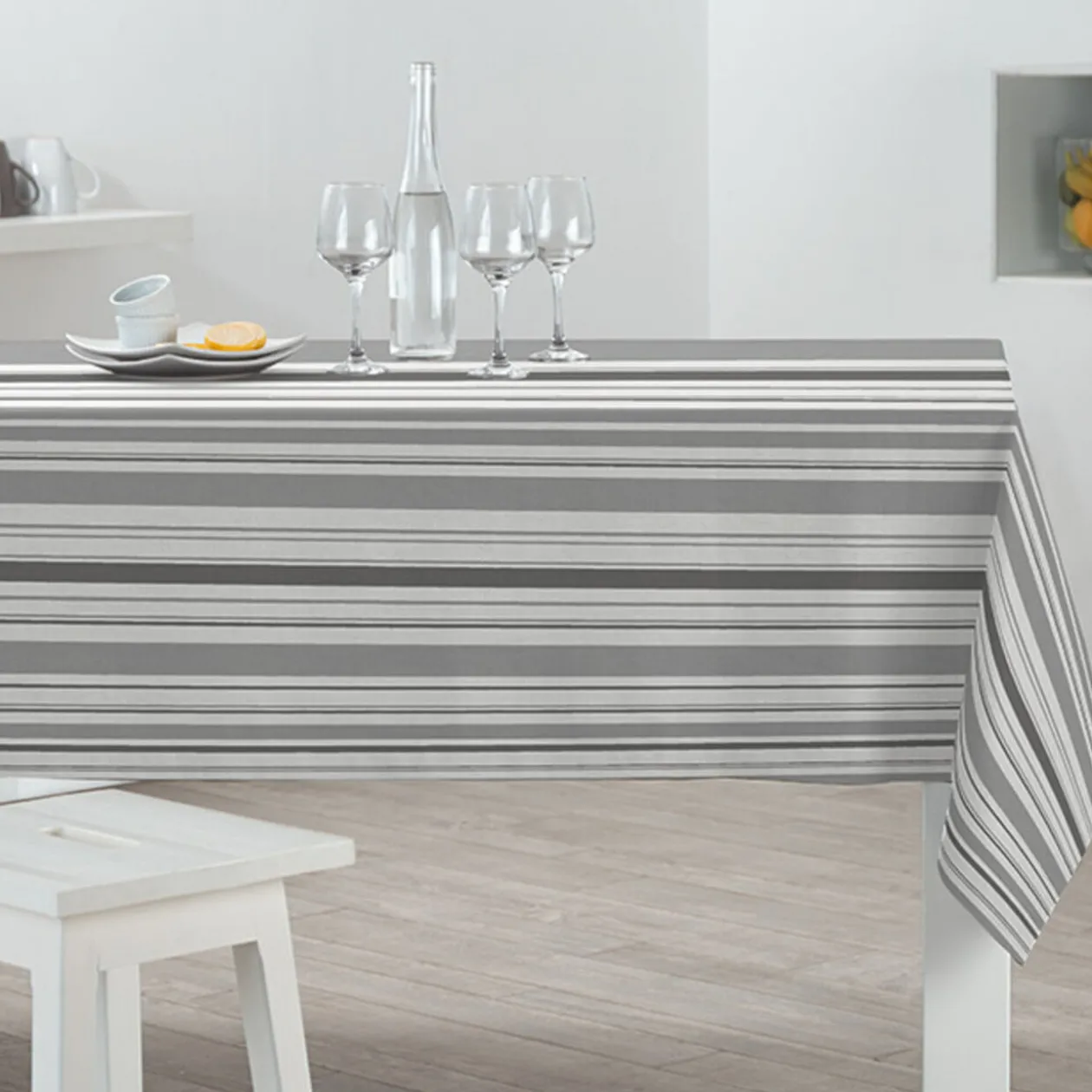 Nappe toile cirée rectangulaire rayée grise et blanche, dim. 140×250 cm, plastique