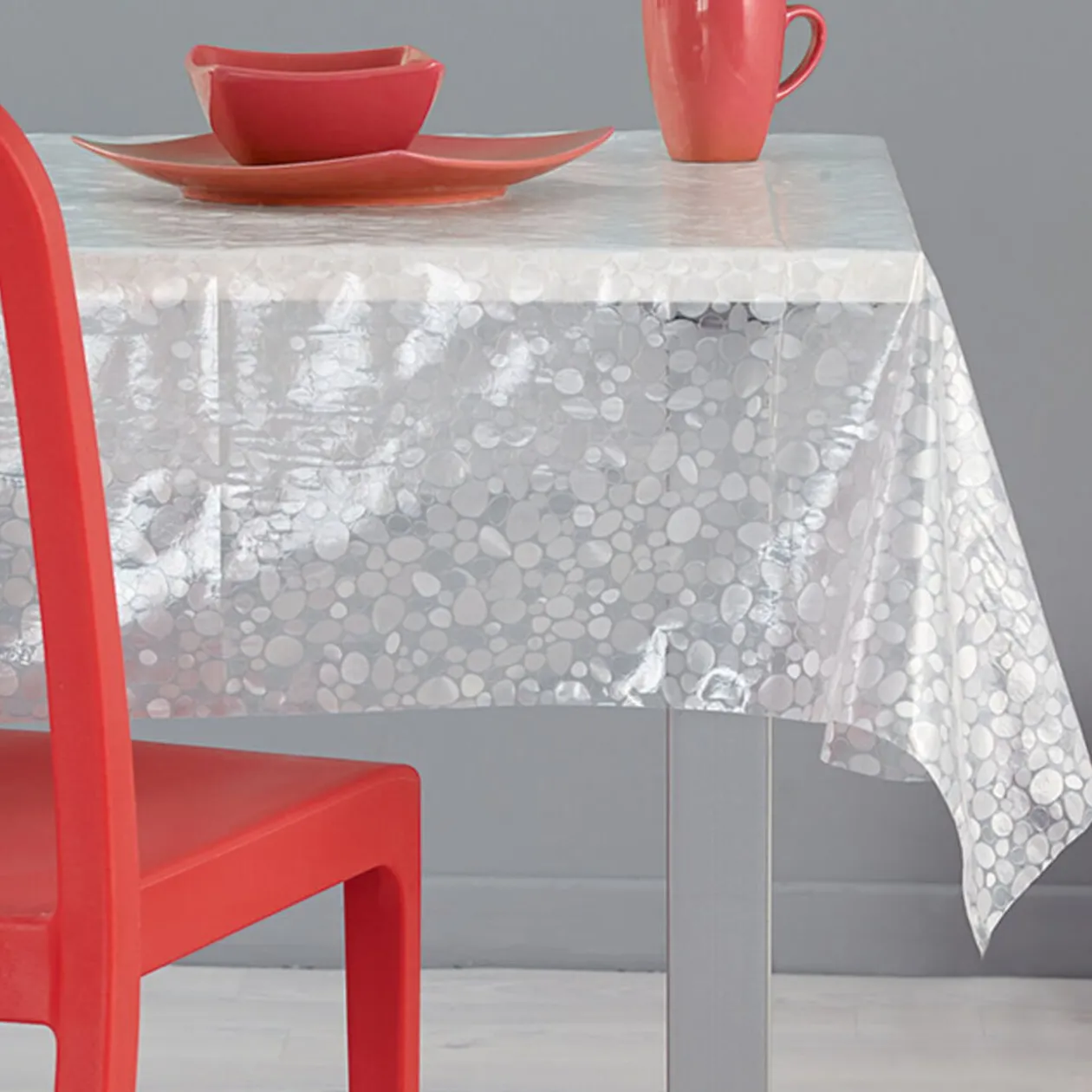 Nappe rectangulaire transparente design galets 3D blancs, dim. 140×240 cm, plastique.
