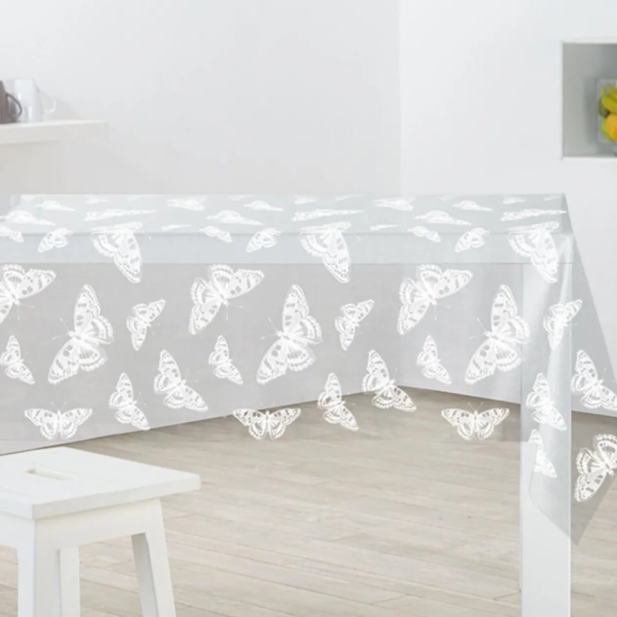 Nappe rectangulaire transparente, motifs papillons blancs, dim. 140×240 cm, plastique.