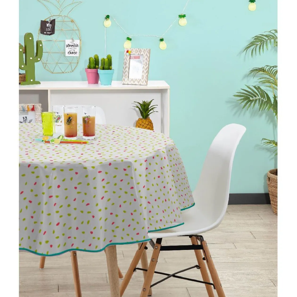 Nappe de table ronde sur fond blanc à motifs verts et roses.