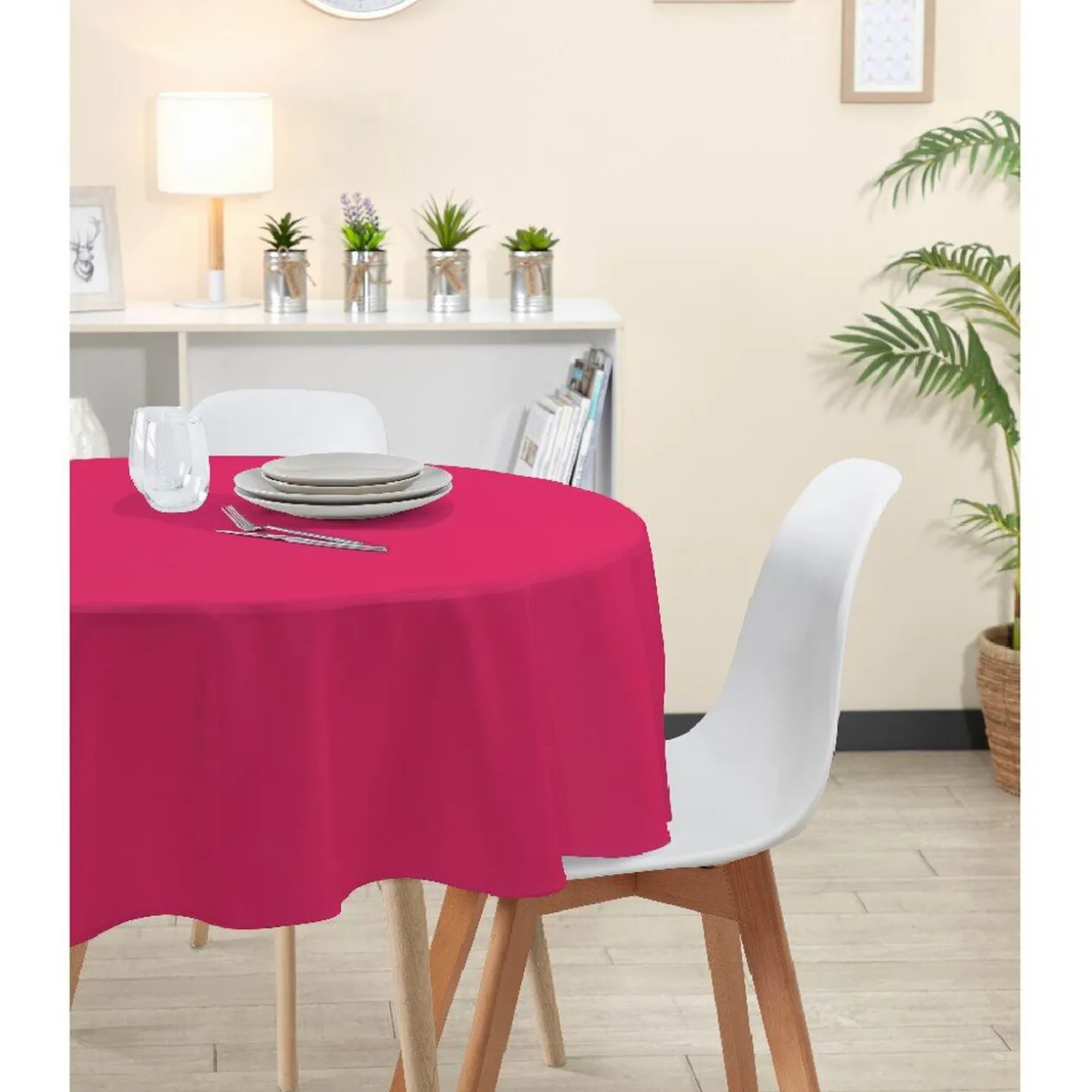 Nappe de table ronde de couleur rose unie.