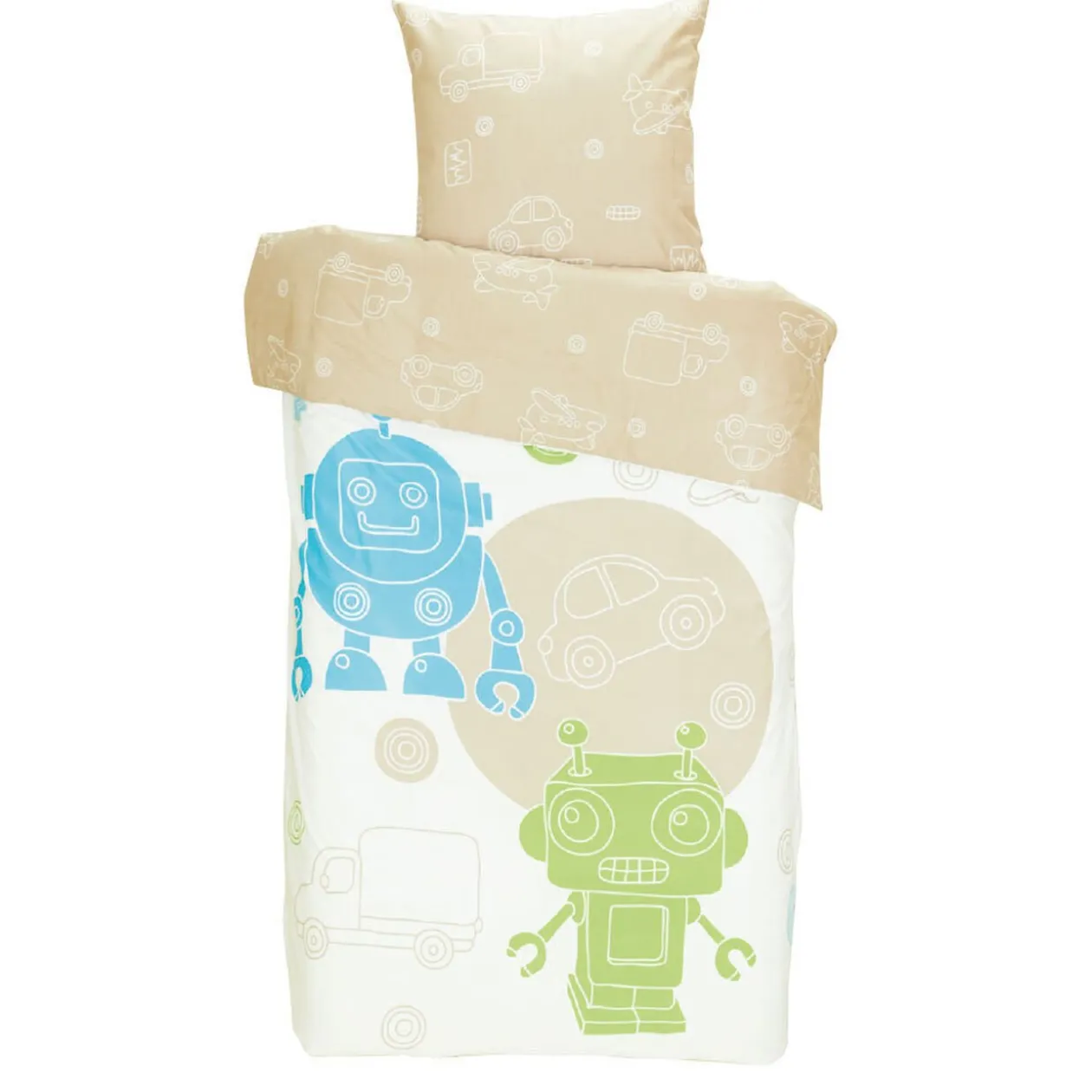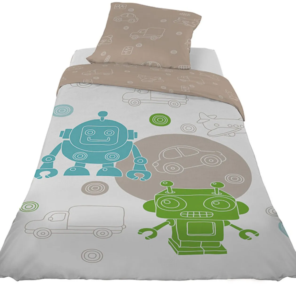 Parure de lit 1 place design robots comprenant 1 housse de couette dim. 140×200 cm et 1 taie d’oreiller dim. 63×63 cm, 100 % polyester microfibre. Toucher peau de pêche, repassage facile.