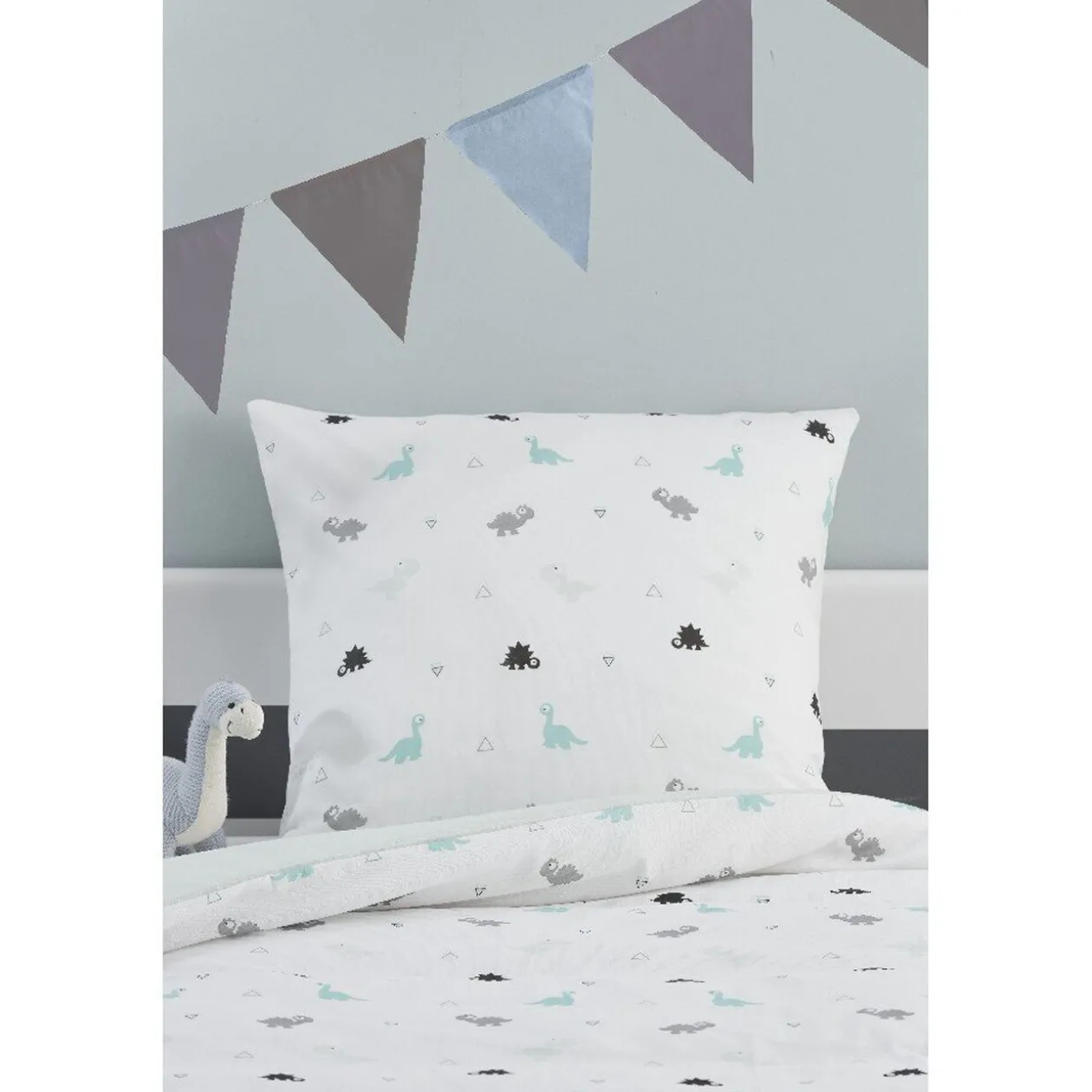 Fais des rêves remplis d’aventures avec les dinosaures de ton oreiller et de ta housse de couette. Le diplodocus, le tyrannosaure et le stégosaure te protégeront la nuit. Cette parure de lit sera parfaite pour la chambre d’un enfant courageux et fort comme toi ! .