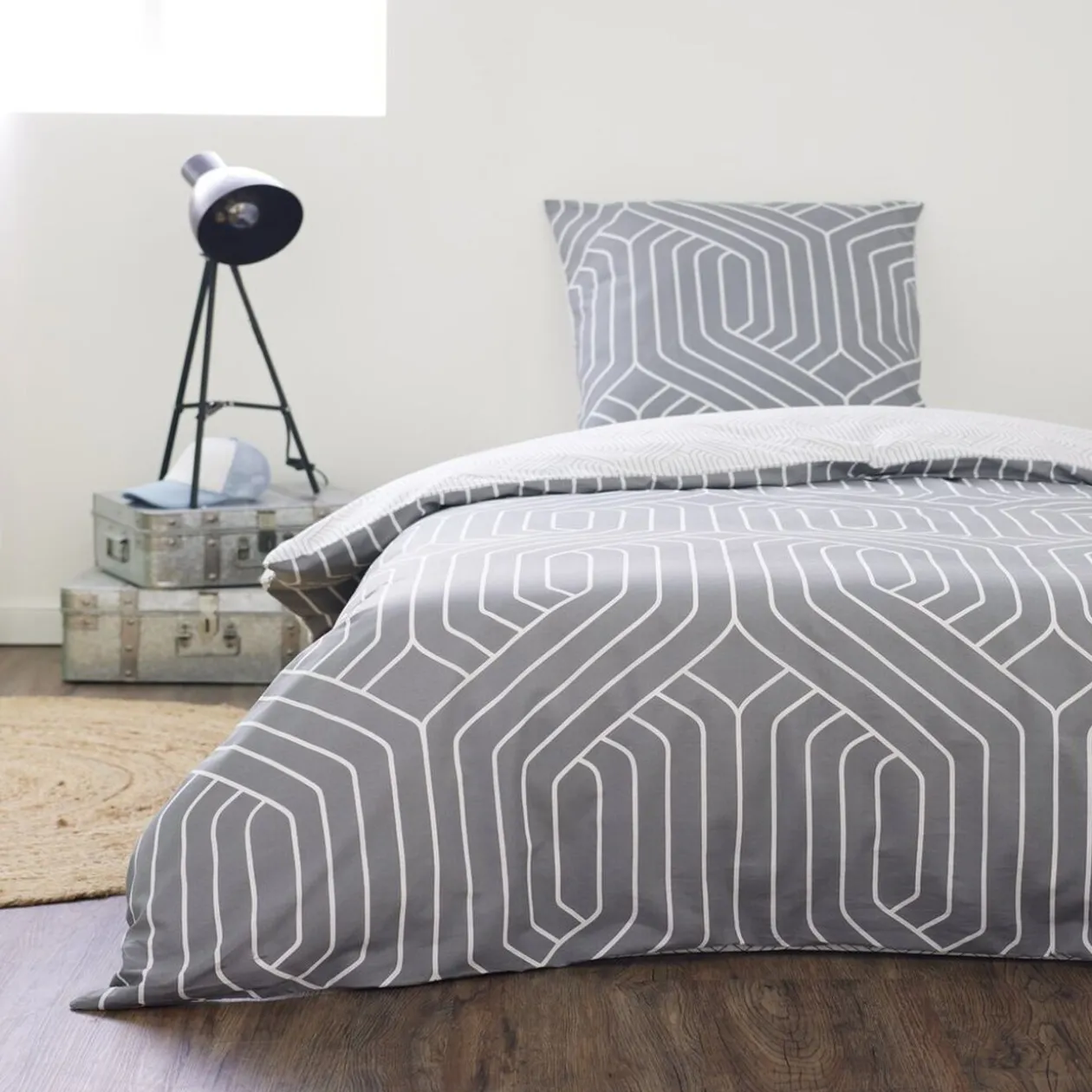 Composée d’une housse de couette de 140×200 cm et d’une taie d’oreiller de 63×63 cm, cette parure en coton doux est ornée de motifs géométriques gris.