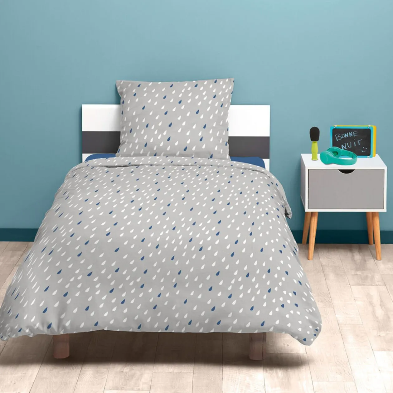 Parure de lit 1 personne de couleur grise imprimée de gouttes blanches et bleues.
