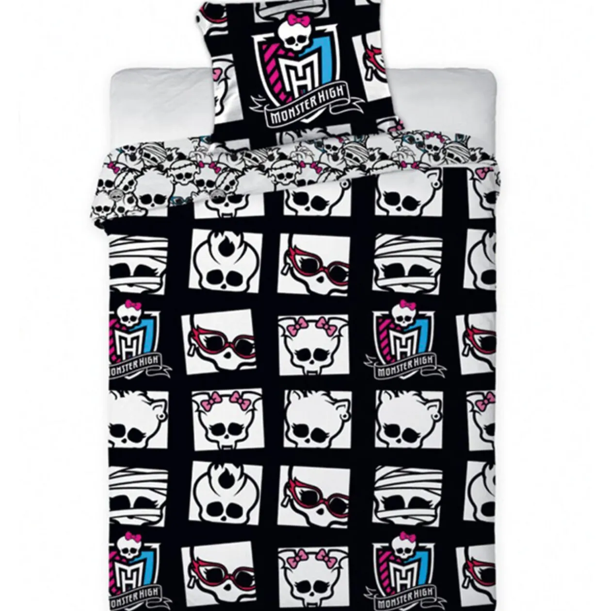 Parure de lit 1 place Monster High comprenant 1 housse de couette dim. 140×200 cm, 1 taie d’oreiller dim. 63×63 cm, coton.