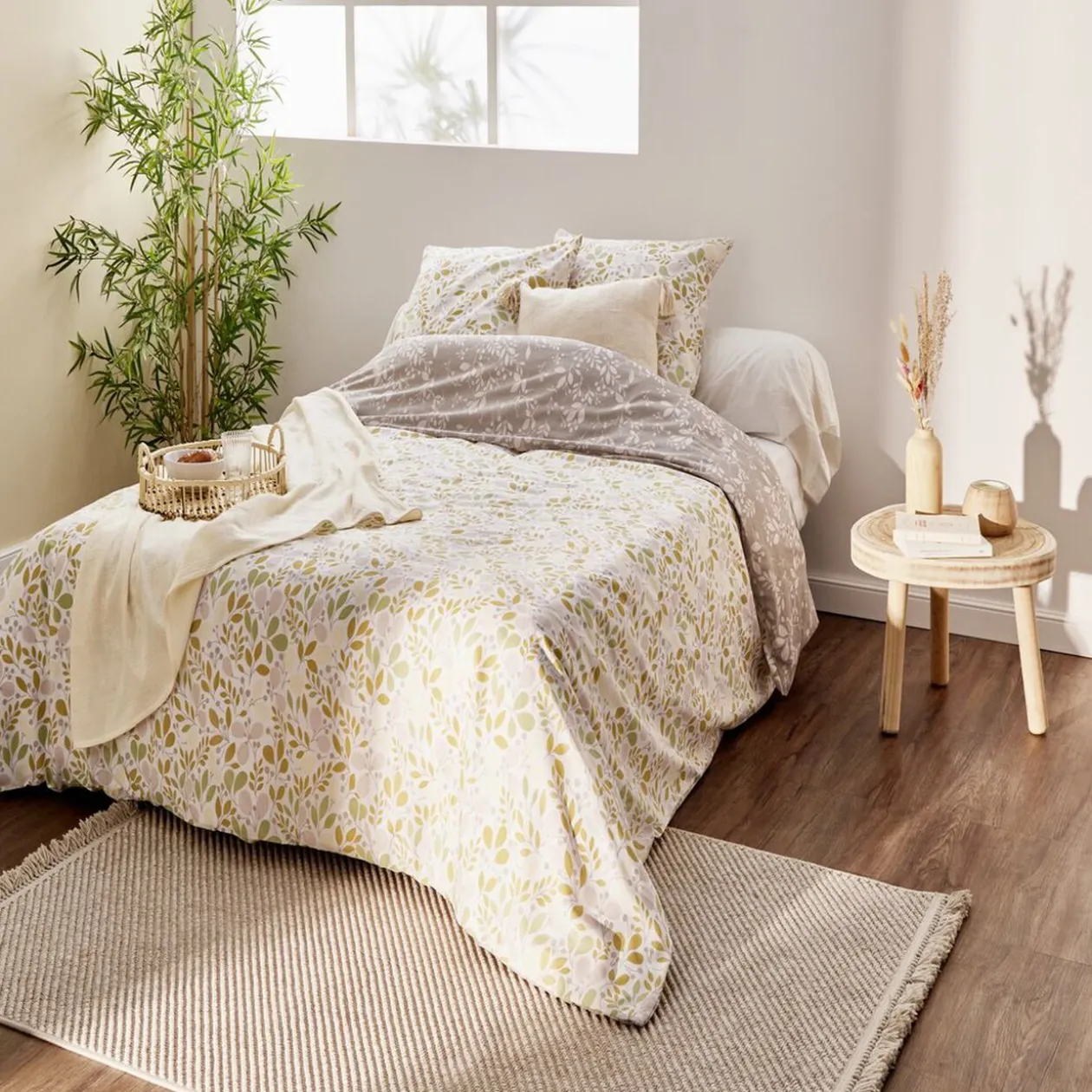 D’un côté gris à motifs floraux et de l’autre blanc avec fleurs imprimées dans les tons roses, cette parure viendra joliment habiller un lit en 140x190cm.