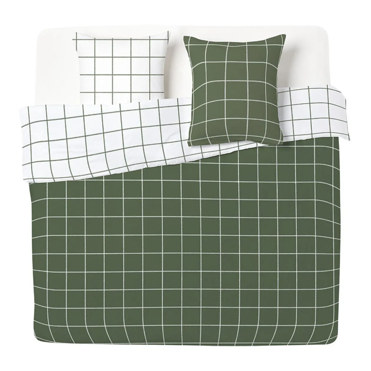 Quadrillée sur chaque face, cette parure de lit réversible d’un côté vert foncé et de l’autre blanche, est idéale pour un lit en 160x200cm et agrémenter la décoration d’une chambre.